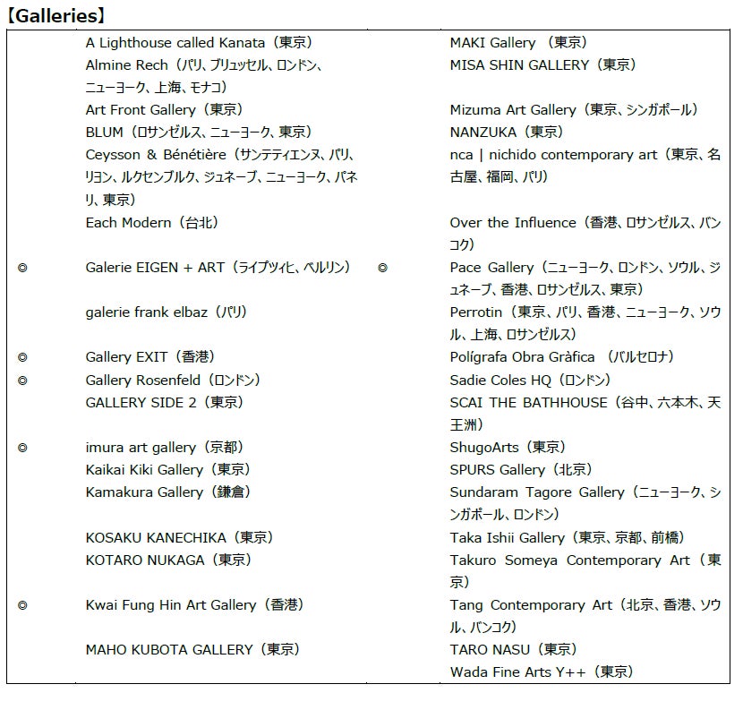 今回は、イギリス、アメリカ、フランス、ドイツ、スペイン、韓国を含む18カ国から70に及ぶギャラリーが参加します。世界のトップギャラリー Galerie EIGEN + ART(ライプツィヒ、ベルリン)、Gallery EXIT(香港)、Kwai Fung Hin Art(香港)が初出展となるほか、Almine Rech(パリ、ブリュッセル、ロンドン、ニューヨーク、上海、モナコ)、BLUM(ロサンゼルス、ニューヨーク、東京)、Perrotin(東京、パリ、香港、ニューヨーク、ソウル、上海、ロサンゼルス)、Sadie Coles HQ(ロンドン)、Taka Ishii Gallery(東京、京都、前橋)、SCAI THE BATHHOUSE(東京)などのギャラリーが再出展となります。ギャラリー展示は以下の3つのセクターに分かれ、テーマごとに作品をお楽しみいただける構成となります。