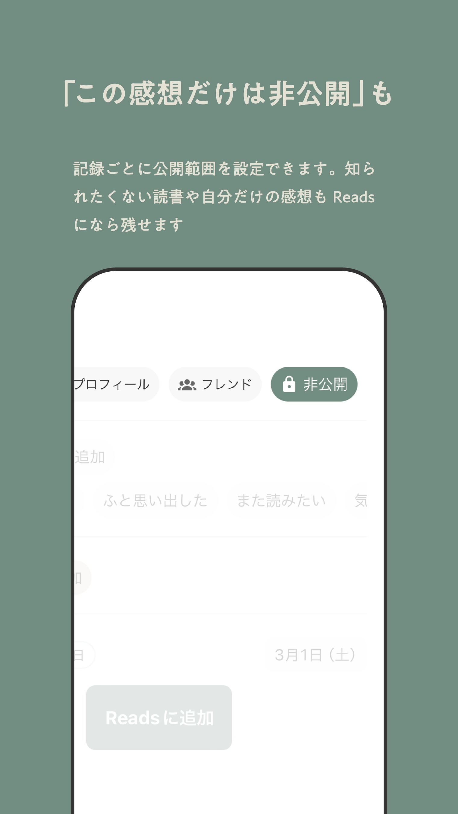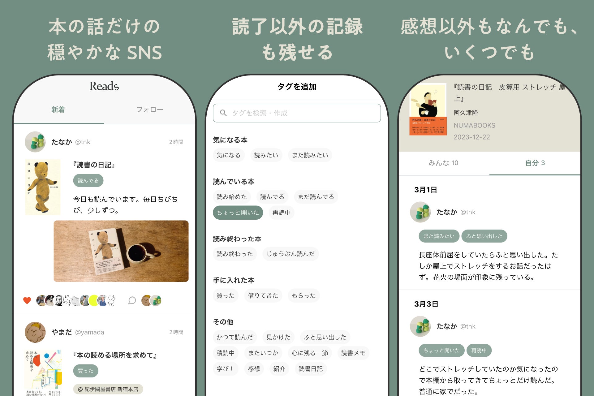 Readsは、好きなスタイルで読書を記録し、思わぬ本と出会い、本が好きな人たち同士でつながることができるアプリです。読了や感想にとらわれることなく、読書をもっと自由に、もっと自分らしく楽しむための機能を提供します。