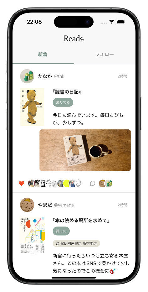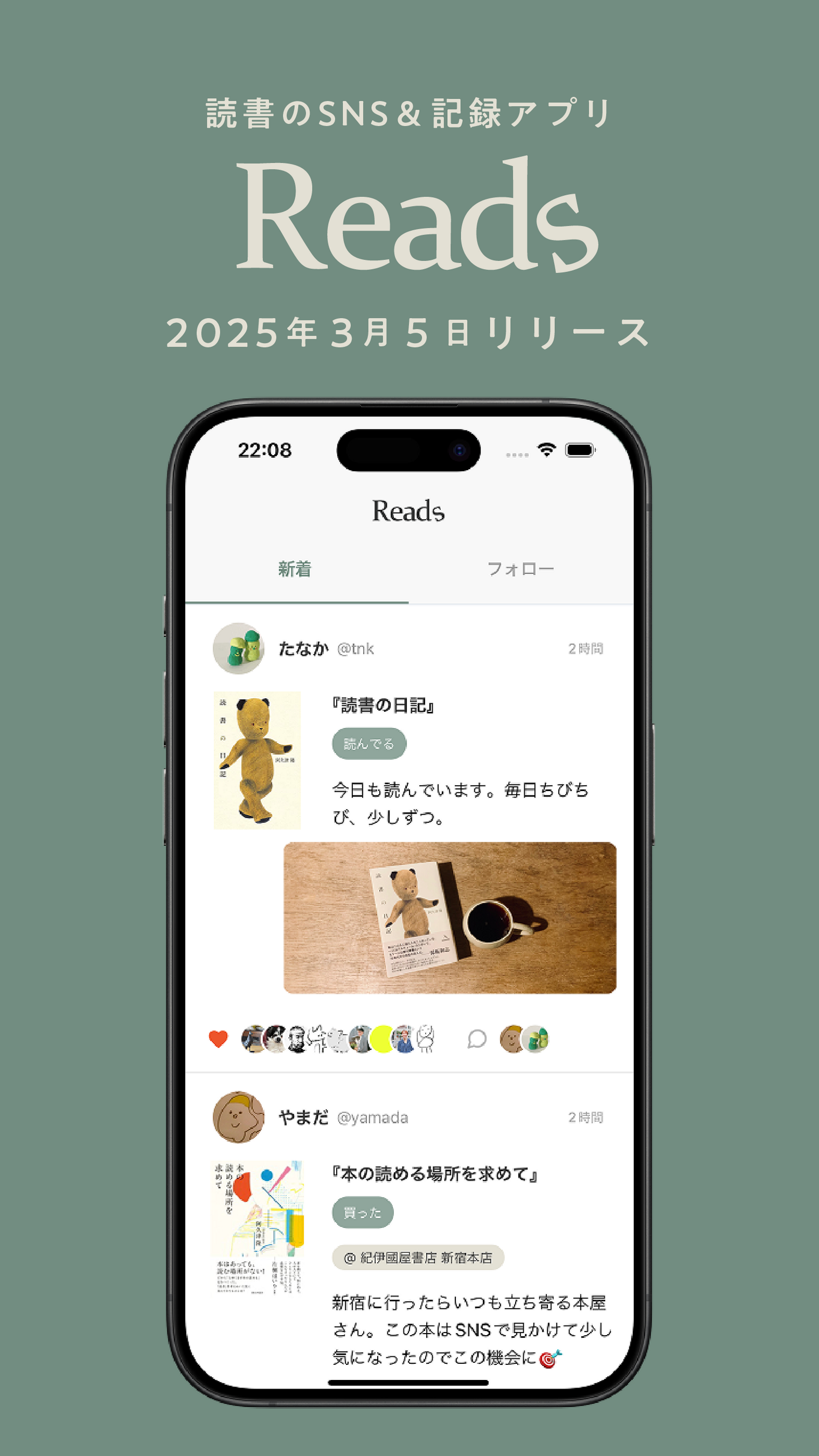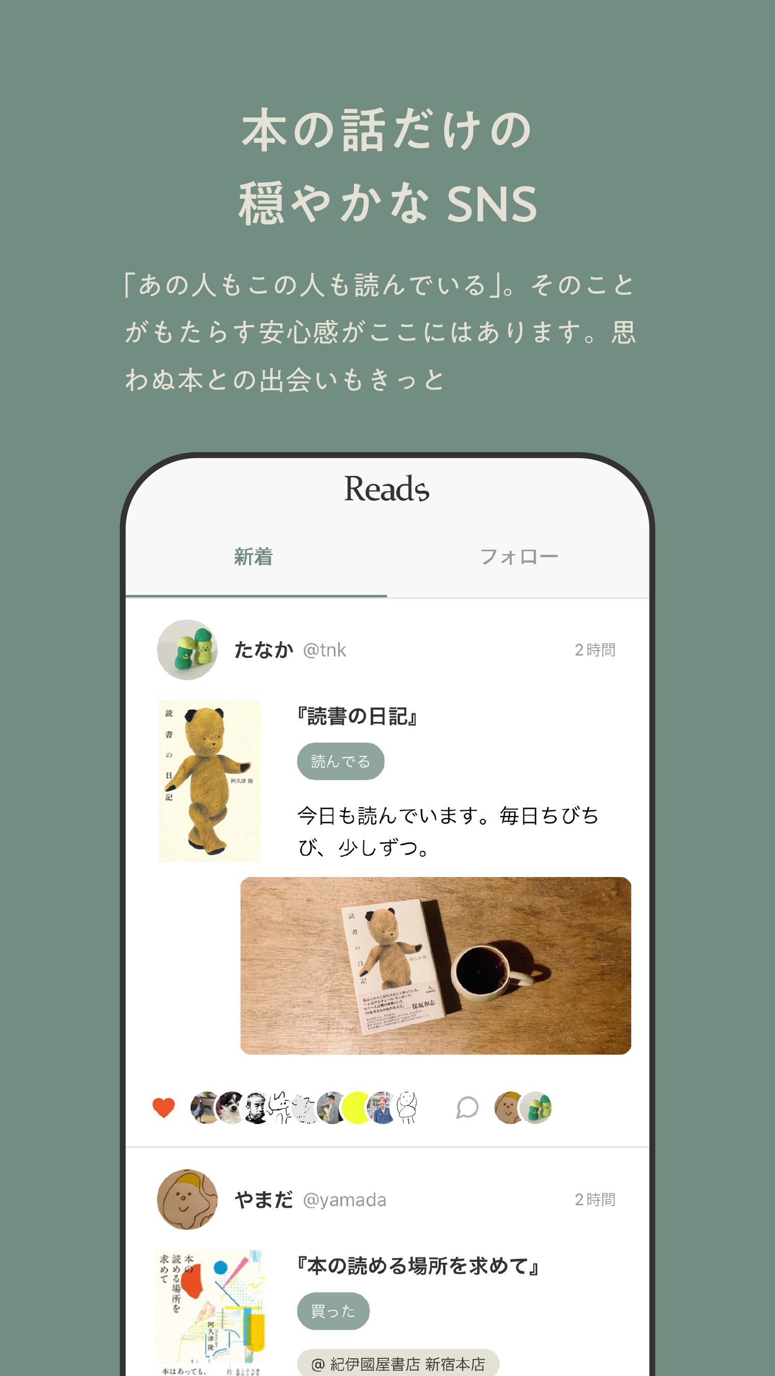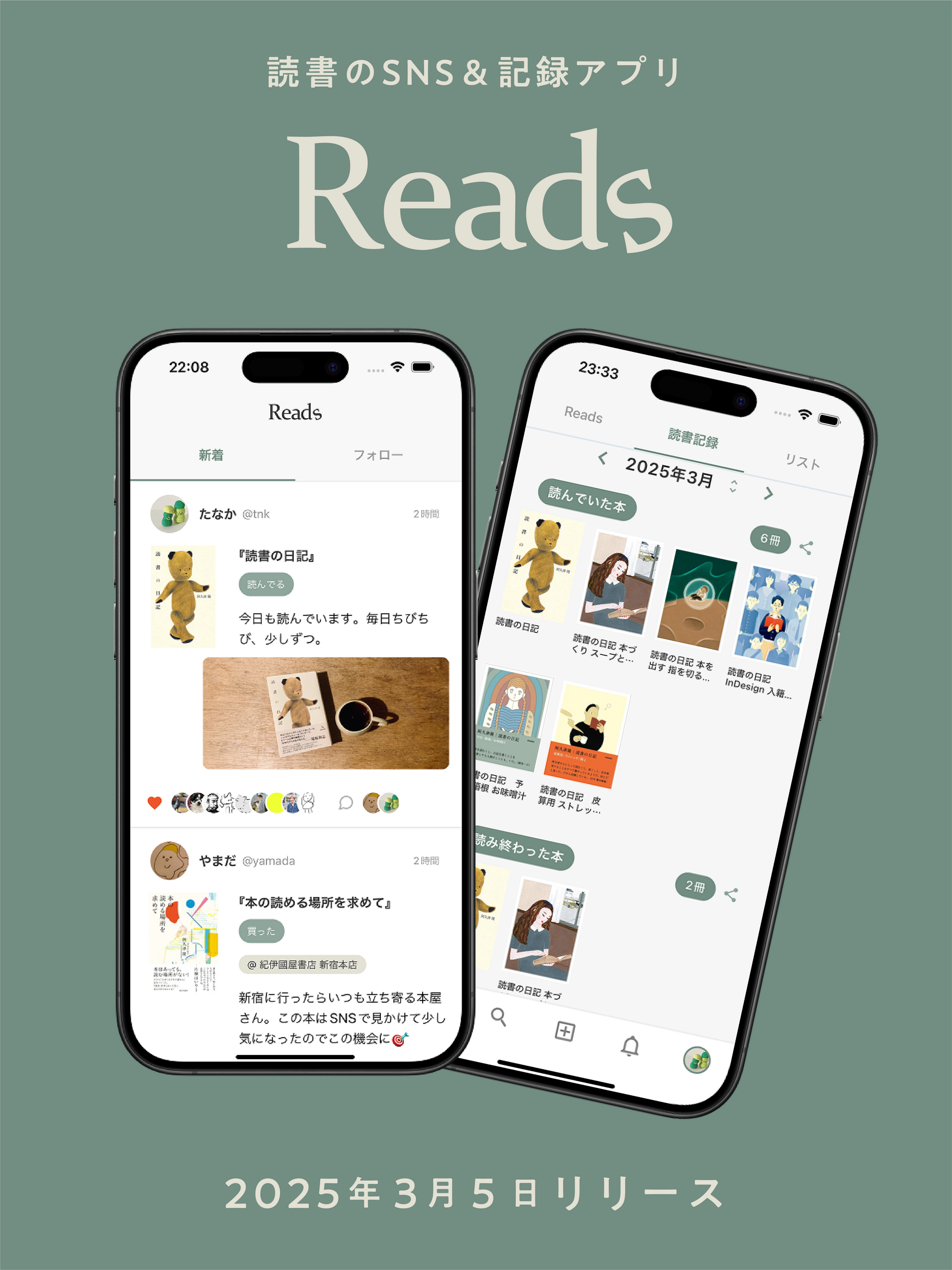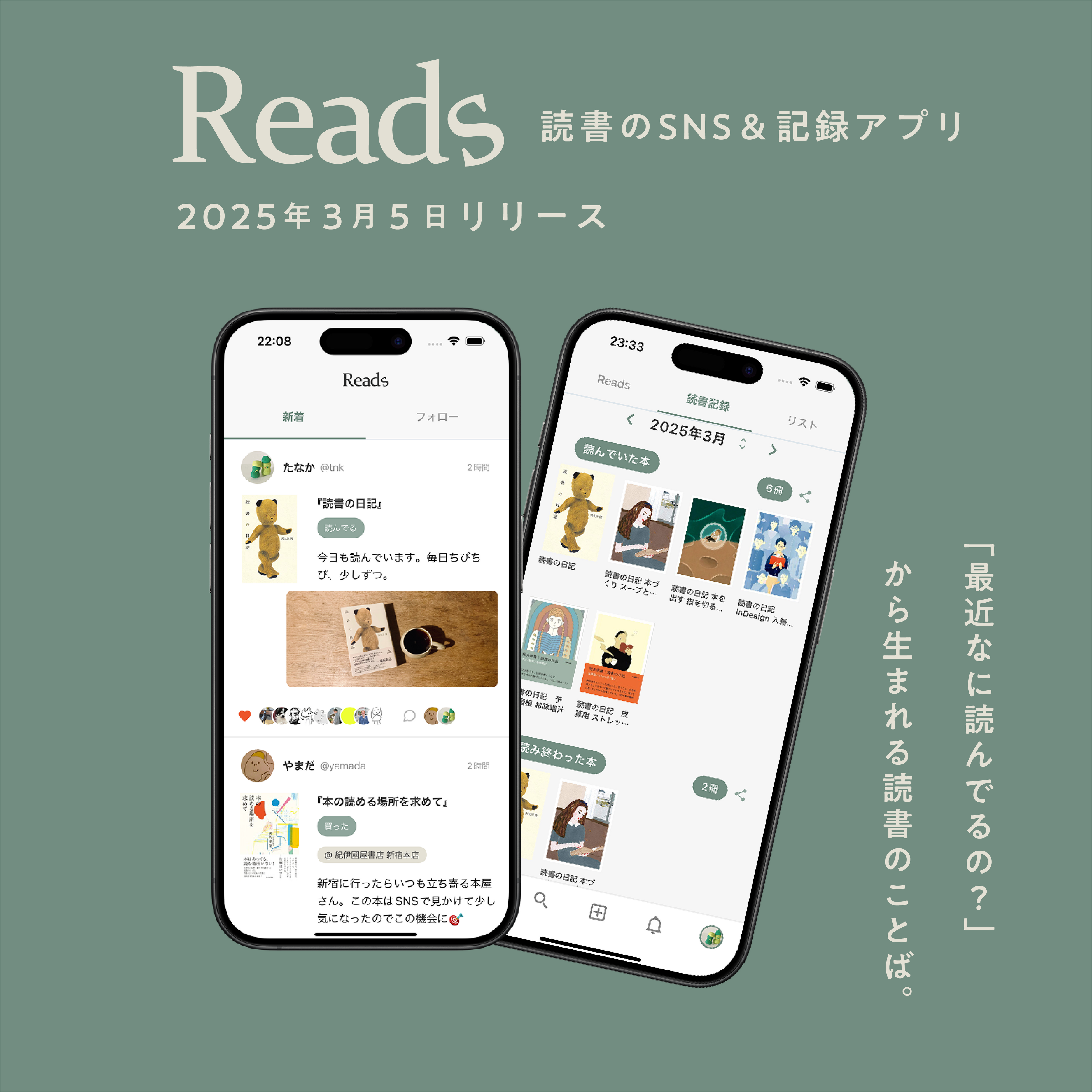 Readsは、本の話だけのSNSとして、本が好きな人が心穏やかに過ごせる広場のような場所を目指しています。