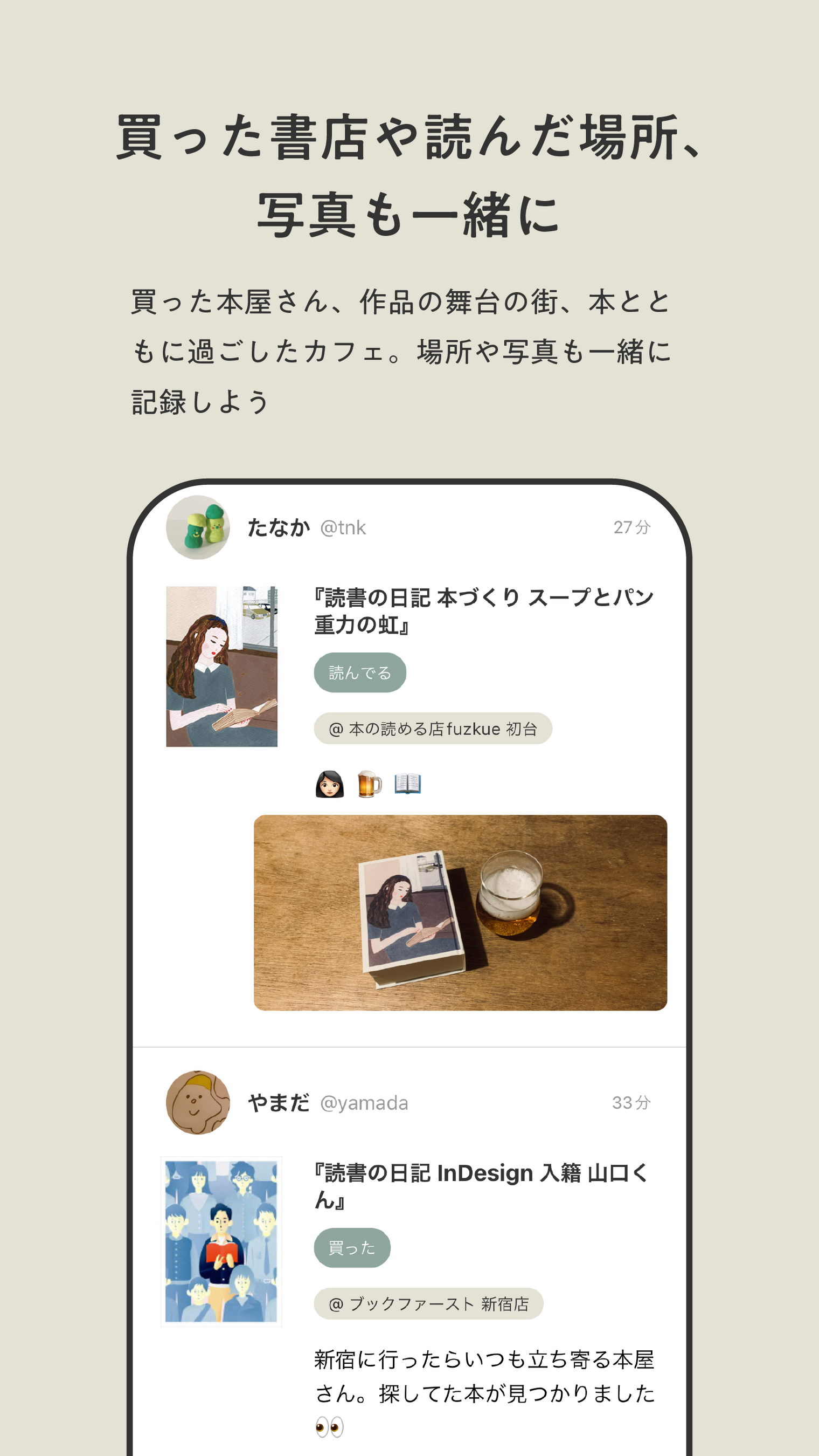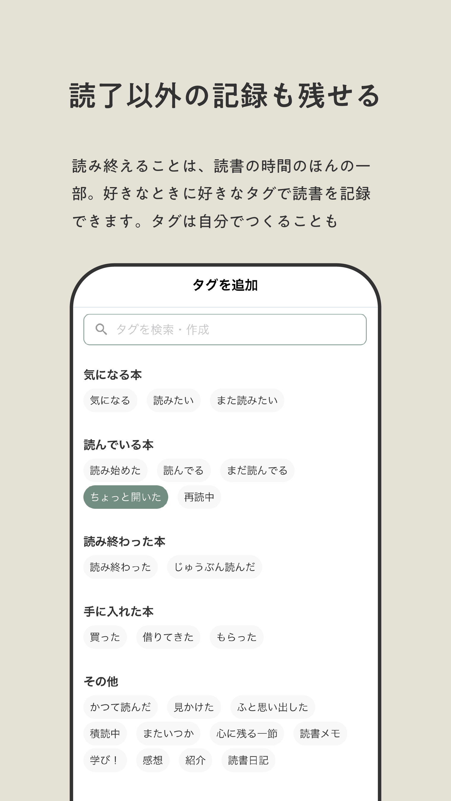 「気になる」「買った」「読んでる」「ちょっと開いた」「ふと思い出した」など、好きなタイミングで好きなタグで本について記録できます