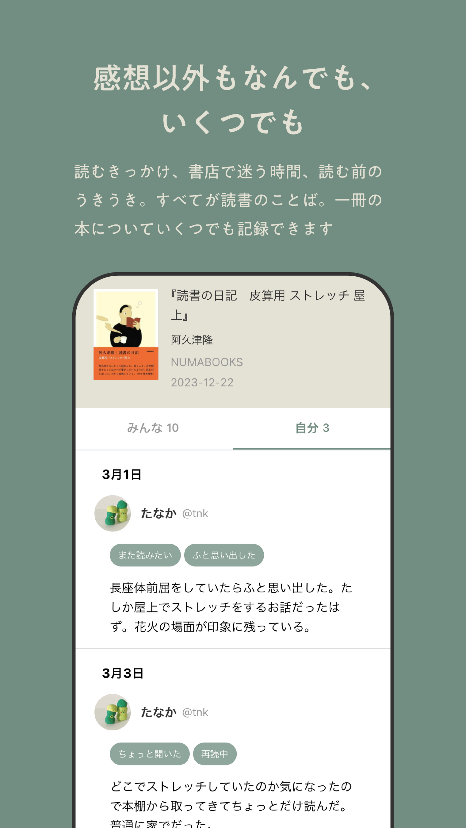 一冊の本についていくつでも記録できるので、「一発でいい感想を書く」というプレッシャーとは無縁です
