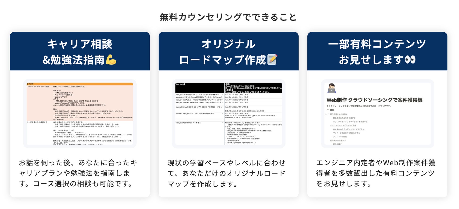 1. 無料で現役エンジニア・フリーランスがキャリア相談に乗ります。あなたに合ったキャリアプランを設計し、勉強法を指南するので、即日行動できるようになります。