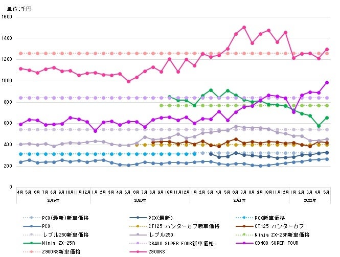 今後は、レブル250やNinja ZX-25Rのように需要と供給のバランスが取れているバイクは通常の相場で推移することが予想されるが、PCX、CT125ハンターカブ等、引き続き需要が高いバイクやCB400 SUPER FOURのように絶版車となるバイクは高水準で推移することが見込まれる。