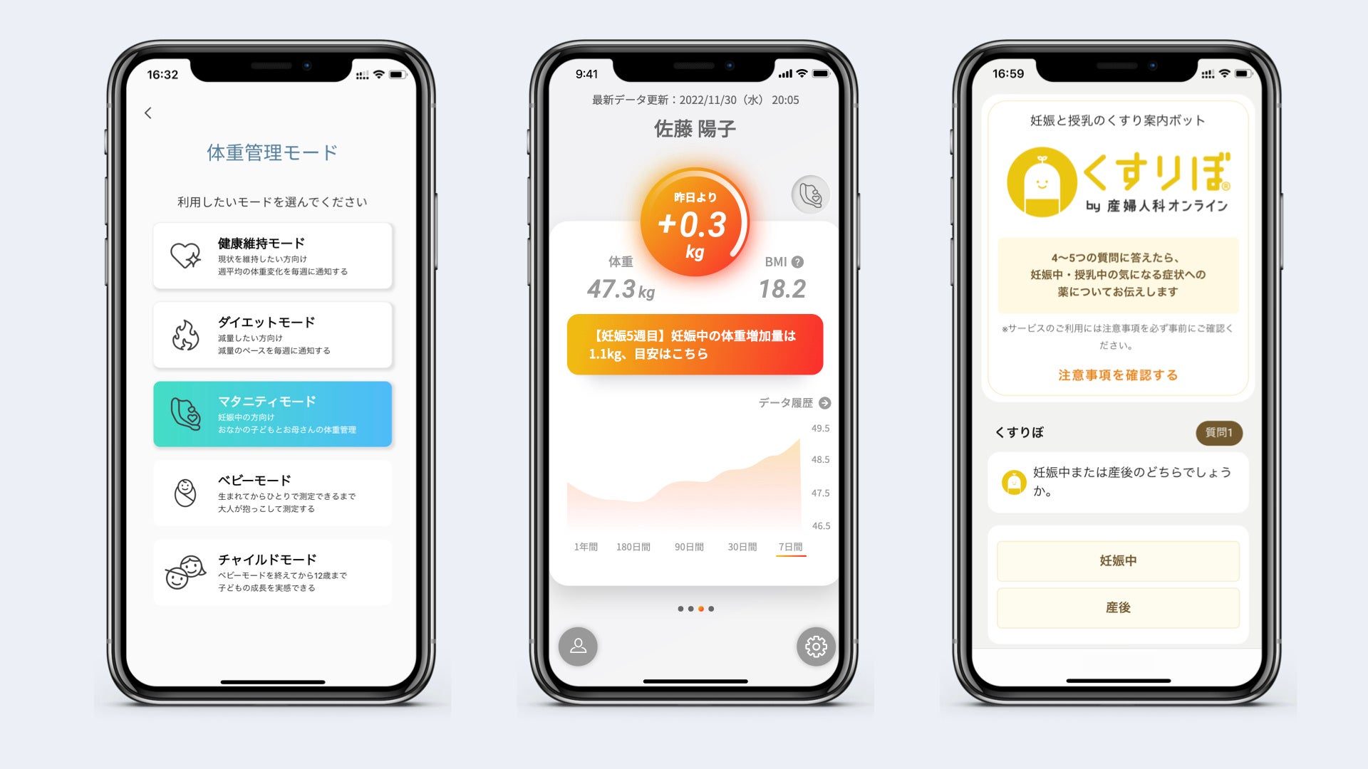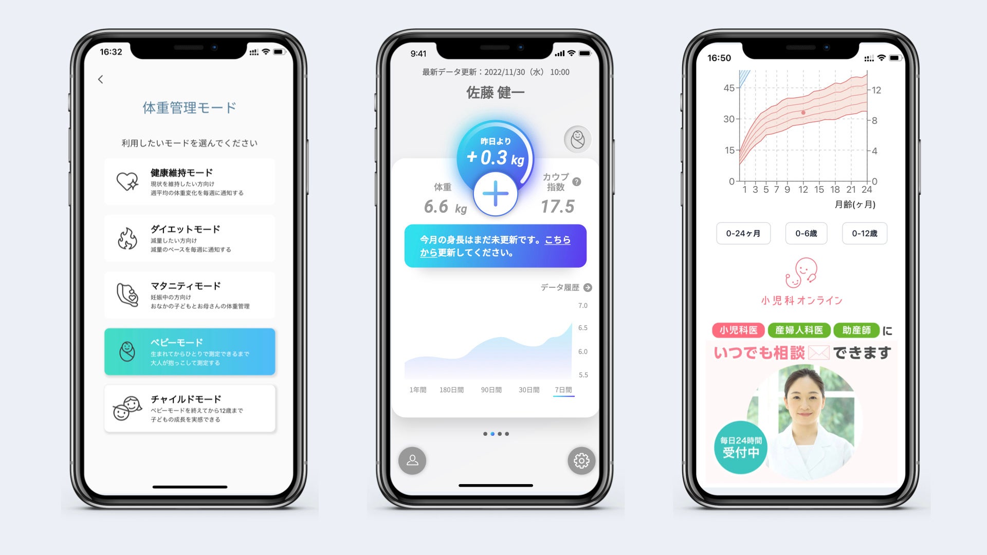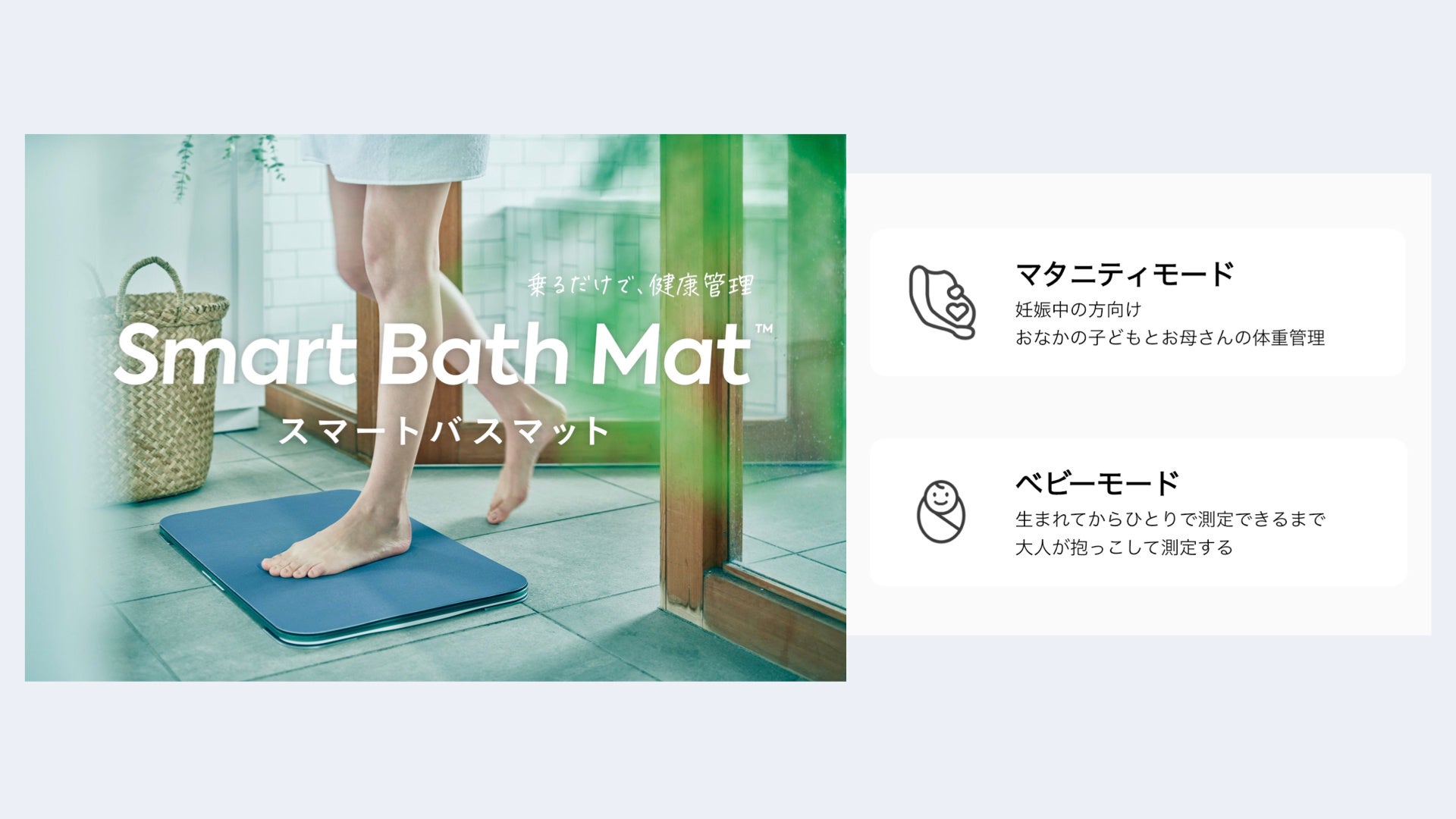 「スマートバスマット™」は”妊娠中”や”新生児”の体重管理に対応。さらに、オンライン医療相談サービス「産婦人科・小児科オンライン」を開始
