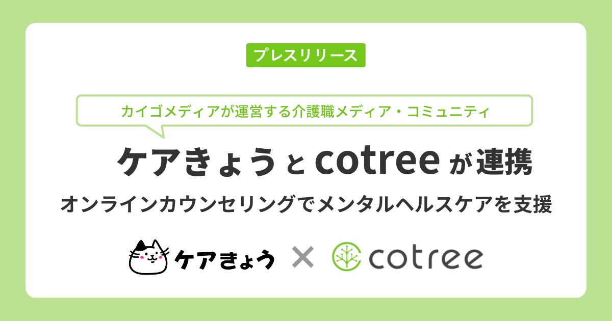オンラインカウンセリング・コーチング事業を展開する株式会社cotree(本社:東京都中央区、代表取締役:西岡 恵子、以下cotree)は、介護職メディア・コミュニティ「ケアきょう」を運営する株式会社カイゴメディア(本社:東京都渋⾕区、代表取締役:向笠 元、以下カイゴメディア) と2022年8月2日(火)より連携を開始しましたことをお知らせいたします。
