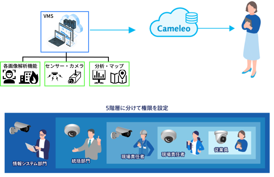 パナソニックコネクト社が提供するCameleoを使用し、クラウド経由で映像のライブモニタリングを行うことが出来ます。Scylla VMSとCameleoのAPI連携を行う事で、Scyllaで検知した内容をクラウド録画し、離れた場所からお手持ちのデバイスで確認する事が可能になります。複数の店舗や複数の顧客を管理・統合することに適したクラウド録画システムと連携し、さらなる拡張性を提供します。