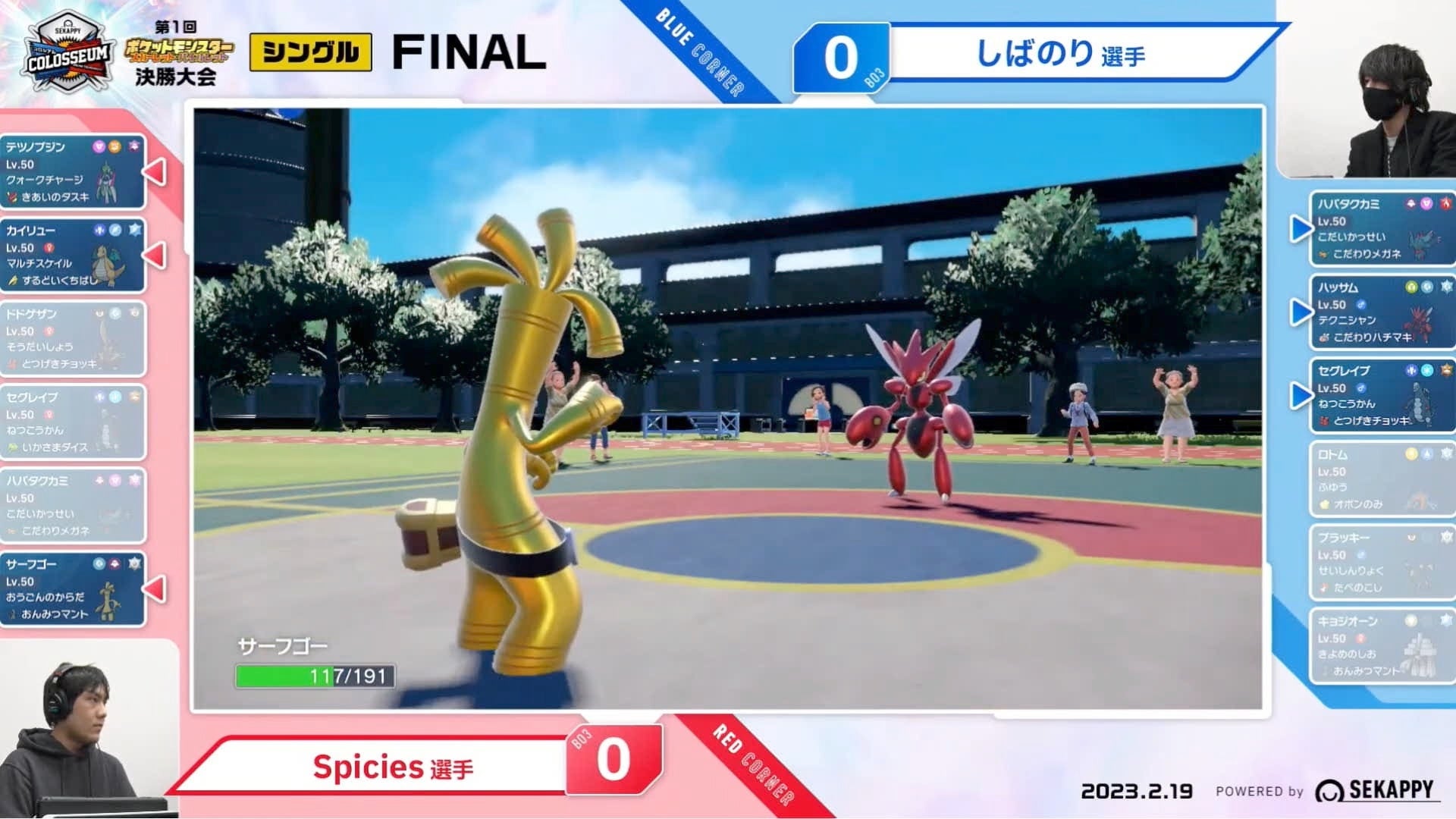 再びサーフゴーとハッサムが向き合う状況になるが、わざが1種類しか使えないハッサムではサーフゴーの突破はかなわず。「バレットパンチ」に「じこさいせい」を合わされたのを見届けたしばのり選手が降参。現役のShadowverseプロ選手として活躍するSpicies選手が読み合いの強さを見せ、1戦目を制した。