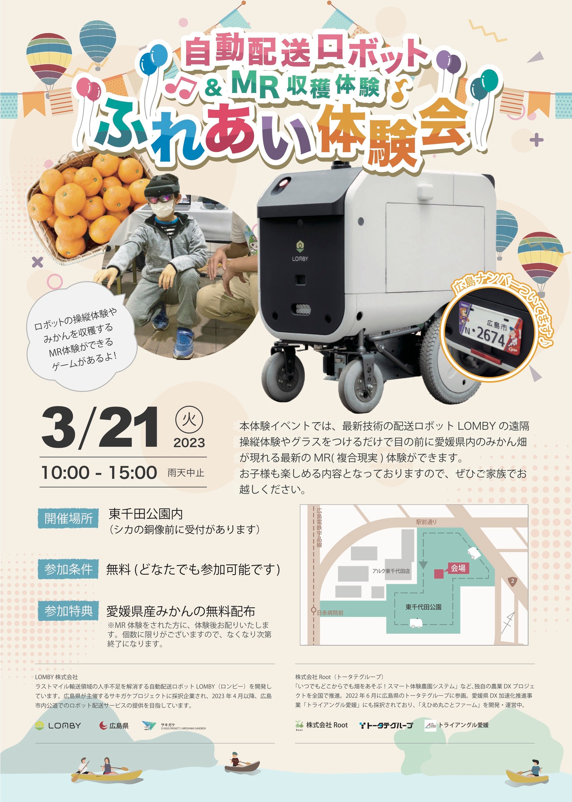 最新の技術を活用した自動配送ロボットと今話題のMR(複合現実)に気軽に触れることができる体験会を広島市内の東千田公園で実施いたします。体験会では、ロボットを見るだけでなく、遠隔操縦の体験ができます。また、愛媛県内のみかん畑とコラボレーションしたMR(複合現実)を活用した収穫体験もご用意しており、会場ではMR体験の舞台となっているみかん畑で実際に収穫されたみかんの配布も行う予定です。今年4月に道路交通法の改正が予定されており、同公園周辺でも自動配送ロボットを用いたデリバリー実証実験が計画されております。