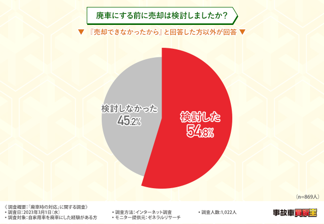 「廃車にする前に売却は検討しましたか?」と質問したところ、半数以上の方が『検討した(54.8%)』と回答しました。