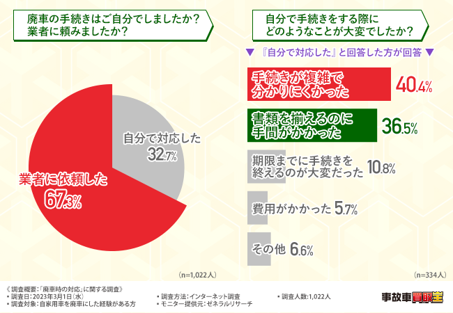 「廃車の手続きはご自分でしましたか?業者に頼みましたか?」と質問したところ、6割以上の方が『業者に依頼した(67.3%)』と回答しました。