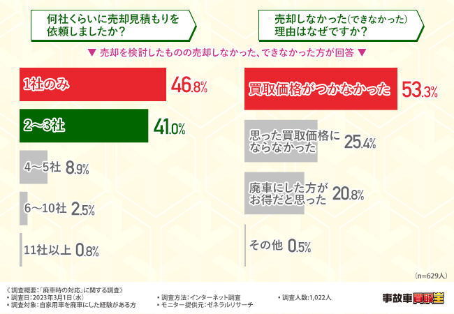 できれば売却したいと思い検討したものの、買取価格が理由で廃車を選択した方が約8割いるということが分かりました。