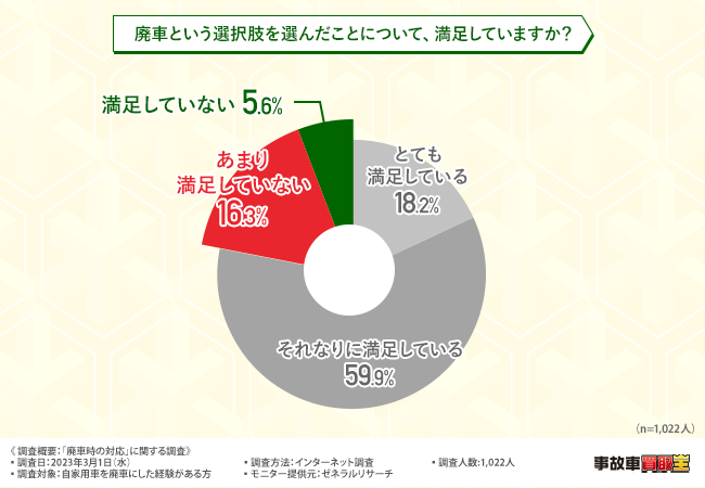 最後に、「廃車という選択肢を選んだことについて、満足していますか?」と質問したところ、『とても満足している(18.2%)』『それなりに満足している(59.9%)』『あまり満足していない(16.3%)』『満足していない(5.6%)』という回答結果になりました。