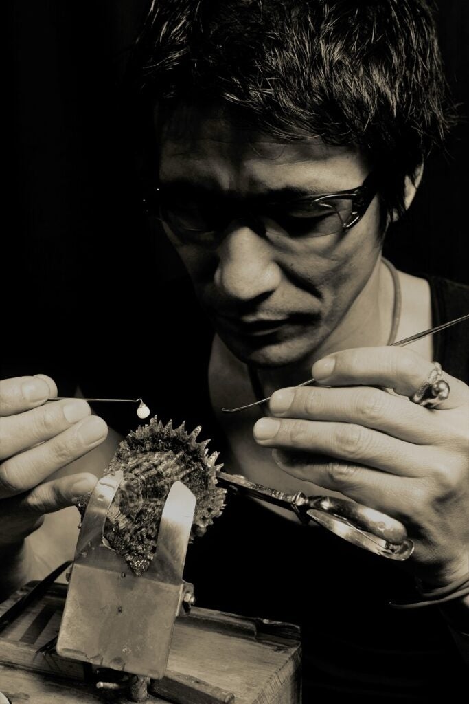 物心がついた時から真珠が身近にある環境に育ち、自然の流れで上村真珠養殖の三代目としてあこや真珠養殖の世界に入りました。核入れの技術を身に付け、良質な真珠を作り出す中で、色々な形の真珠に出会い、もっとおもしろいデザインのジュエリーができるのではないか?と創作を始めました。他の誰もやっていないであろうアイデアが浮かんでは試行錯誤し、完成するまで諦めずに信念を持って取り組みました。現在もパールジュエリーアーティストとして、様々な真珠の魅力を引き出し、他に類を見ない作品を作り続けています。