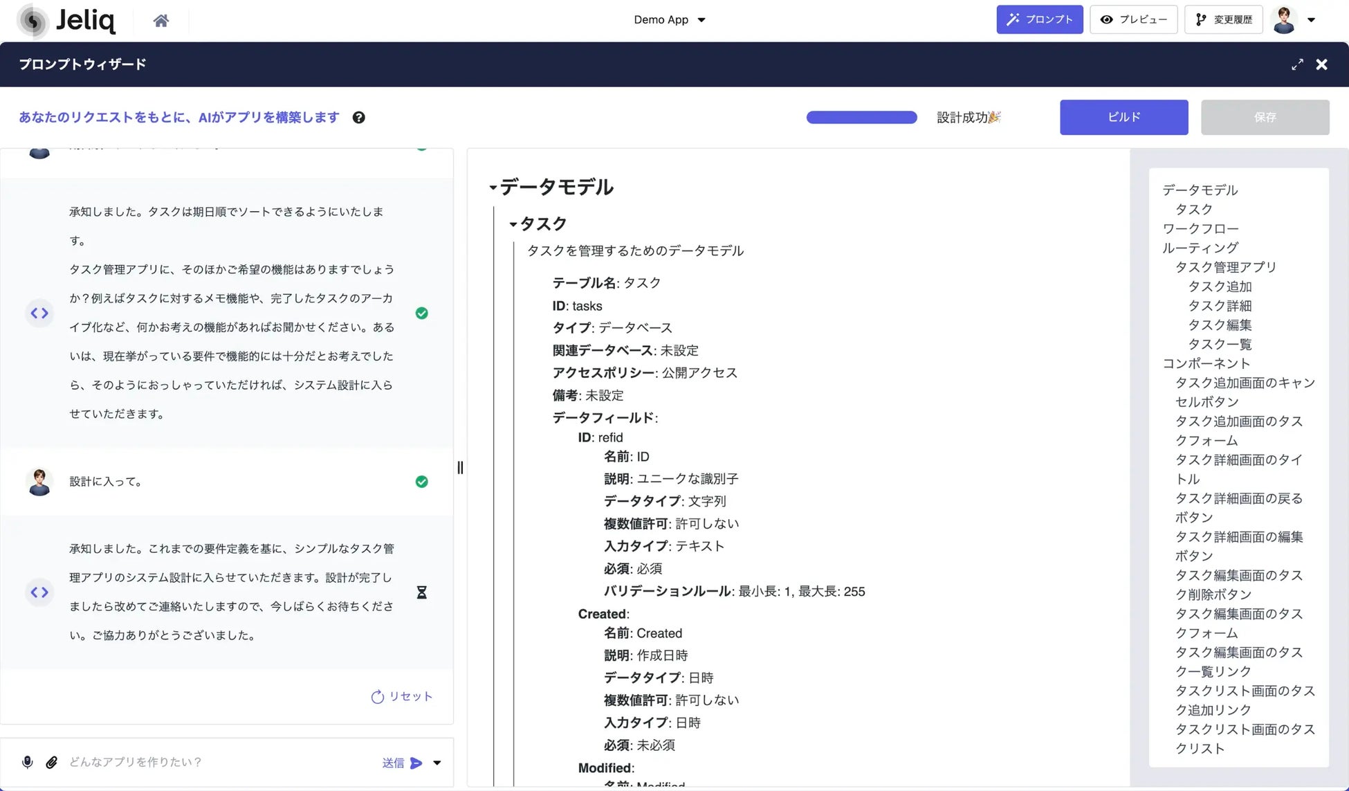 Jeliqは、AIとの対話を通じてアプリケーションの設計・開発が行える革新的なプラットフォームです。
