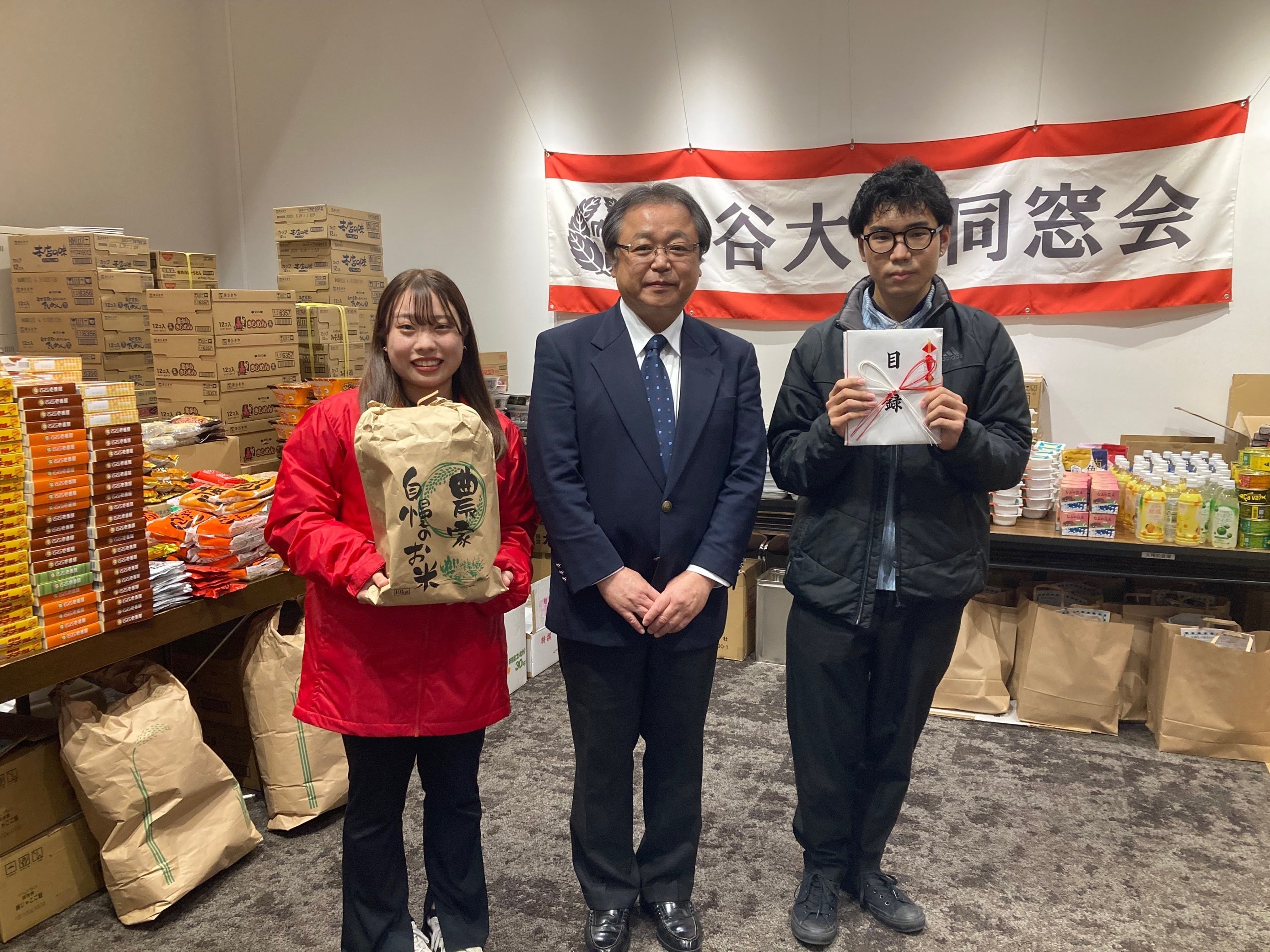 2022年10月から食品のご提供を呼びかけた結果、大谷大学の卒業生である同窓会会員から約5,300食を超える温かいご支援を頂きました。贈呈式では本学の卒業生である東舘 紹見教授(大谷大学同窓会理事長/本学教授)のほか、在学生代表として中央執行委員会委員長代理の苅田 優人さん(文学部第2学年)、学園祭実行委員会委員長の吉見 菜摘さん(教育学部第2学年)に登壇いただき、支援についての想いや学生生活の現状について語っていただきました。東舘教授は、「コロナ禍に加えて値上げラッシュ、地域の特産品を通して少しでも学生生活が楽しかったと思ってもらえると嬉しいです。」と母校の学生に向けて熱いメッセージを贈りました。