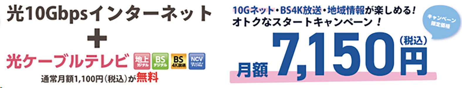 対象期間中、光10ギガインターネットをお申込みのお客さまは、話題のBS4K放送やNCVコミュニティチャンネル(地域情報チャンネル)が見られる光ケーブルテレビ(通常月額1,100円 税込)が永年無料でご利用になれるキャンペーンを実施します。