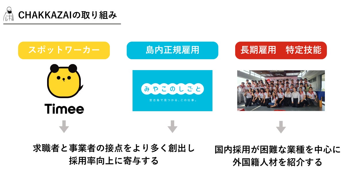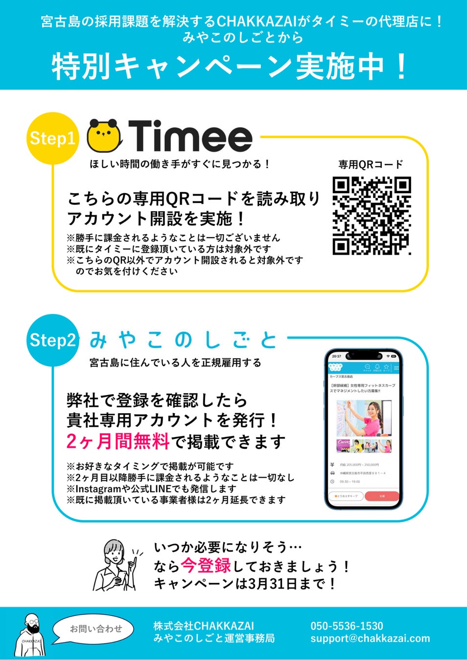 宮古島の事業者の方々にいち早くタイミ―社との取り組みについて知っていただき、採用手段の拡充を行ってもらうため、株式会社CHAKKAZAIよりキャンペーンを用意いたしました。