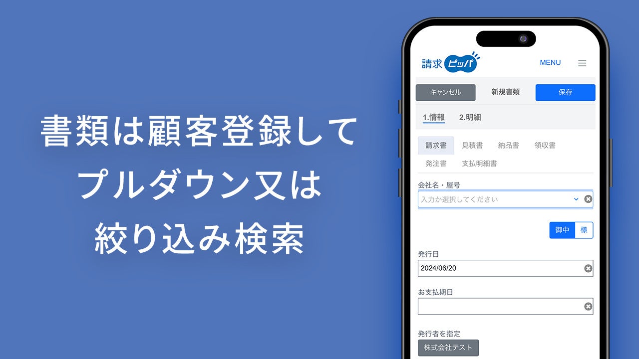 「請求ピッパ」は「インボイス」「電子帳簿保存法」「源泉徴収の計算」に対応し、スマートフォンからでも簡単に請求書を作成できるサービスです。パソコンやタブレットのみならず、スマートフォンから操作しやすいユーザインタフェースを採用し、利便性の高さを追求しました。クラウドサービスであり、どこからでもアクセスおよび請求書の作成が可能です。また、スマートフォンでも取引先へ請求書をPDF形式で送付できます。