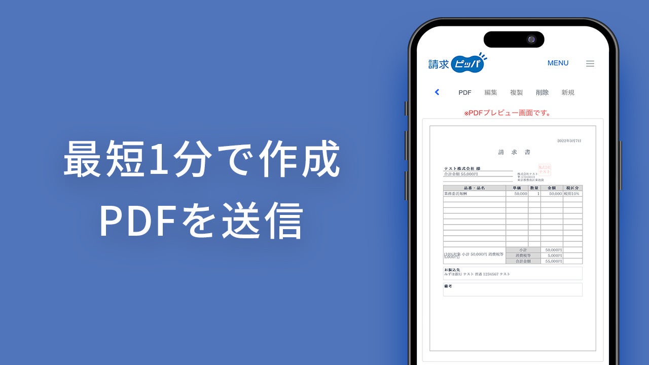 請求ピッパ新規登録から請求書発行までは約1分30秒です。