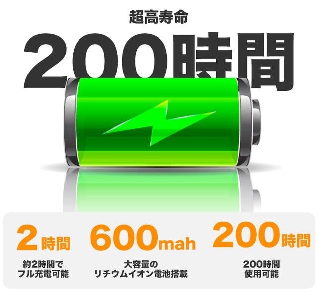 ⑤1度の充電で200時間使用可能