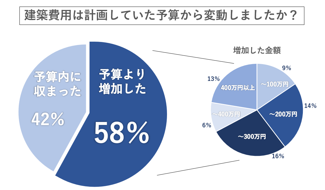 しかし実際に建築した方のなんと約58%が予算より建築費用が増加したという結果に。