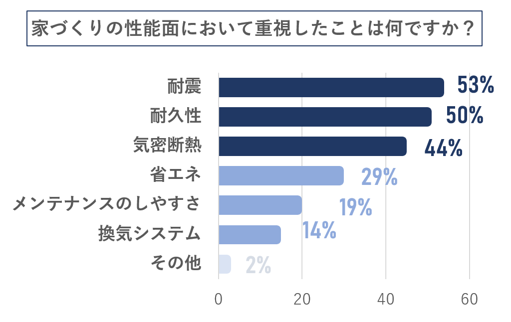 性能面では近年の地震の多さや、温暖化による温度変化が気になるという声が多く、安心で快適なお家時間を過ごすために耐震・耐久性・気密断熱性を重視しているようです。