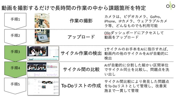 Ollo Factoryは、組み立て作業のような人が行う作業を、AIによって自動で詳細に解析する画像認識ソフトウェアです。カメラで作業を撮影し、撮影した動画をアップロードするだけで、その組み立て作業内での細かい作業ごとの時間や動きのばらつき、改善ポイントなどを瞬時に可視化します。Ollo Factoryによって、これまで一部の改善担当者に依存していた改善業務や、ベテラン作業者の勘やコツの伝承・教育を、短期間で多くのスタッフが実行することが可能になりました。