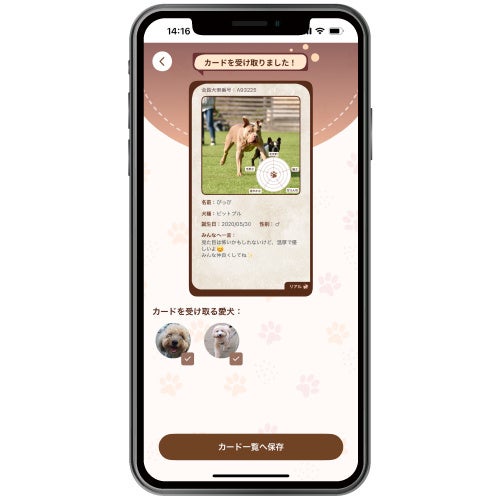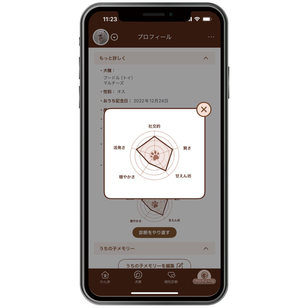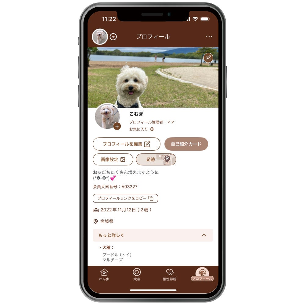 愛犬の登録が完了するとプロフィール・性格診断・写真などを掲載したカードができあがります。さらにアプリ内で出会ったわんちゃんや、現実世界で実際に出会ったわんちゃんと交換可能。SNS連携機能でInstagramやXでもシェアできます。