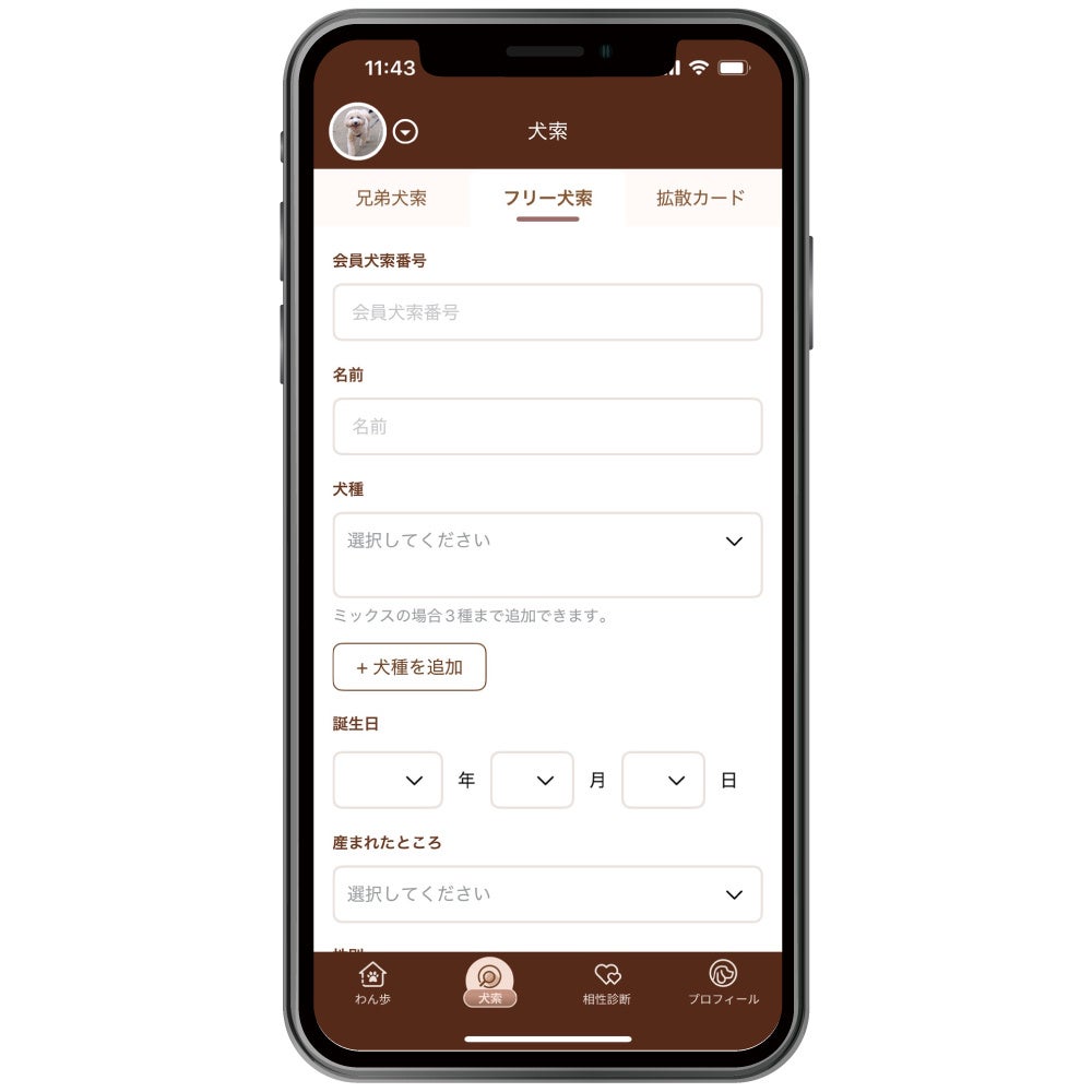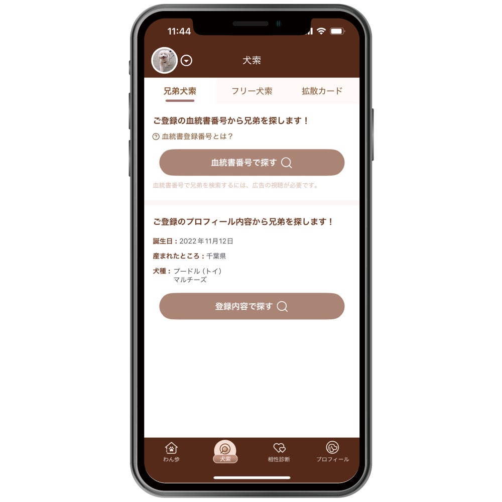 血統書情報や誕生日・犬種をもとに、兄弟犬や親戚犬との奇跡の再会をサポート。「兄弟犬索拡散カード」を作ってSNS拡散も可能です。