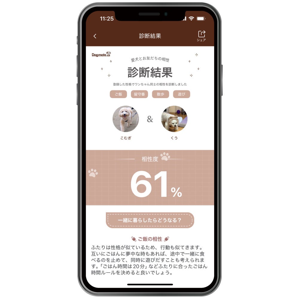 性格診断の結果をもとに愛犬とお友だちの相性を診断。相性度を%表示&「食事」・「遊び」・「散歩」・「留守番」の4つのシーン別にコメント付きで紹介します。