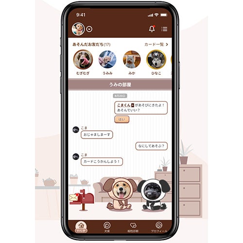 愛犬のキャラクターがアプリ内を自由にお散歩し、他のユーザーの“アプリ内”に訪問。自動マッチングと通知機能で、楽しく交流が始まります。