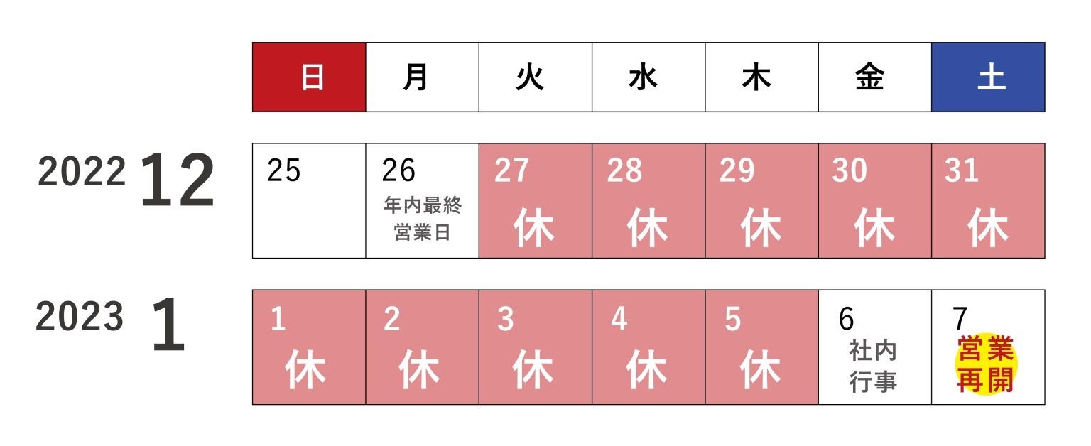 2022年12月27日(火)から2023年1月6日(金)まで冬季休暇とさせていただきます。休暇中にいただいたお問合せについては、1月7日(土)より順次対応いたします。ご不便をおかけしますが、何卒ご理解のほどお願い申し上げます。
