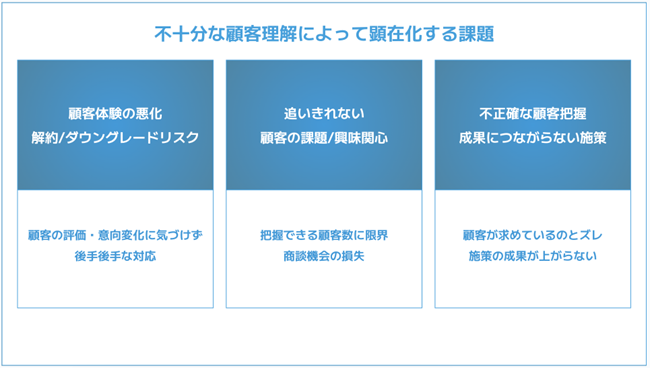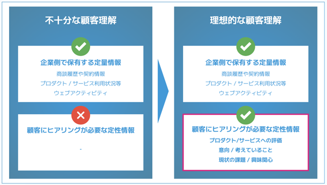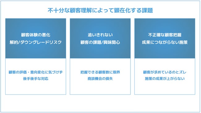 日本国内において、マーケティング・営業・インサイドセールス・カスタマーサクセスといった一貫した営業活動情報を可視化・数値化し、業務効率化や顧客満足度向上を図る取り組みをする企業が出てきています。しかし、これらの営業活動で保有できる情報としては、顧客の⾏動ログ、サービス利⽤状況などの定量的なものに限られています。顧客の状況や意向・興味関⼼などの定性的な顧客情報は、顧客と接点のある部⾨担当者が個別にヒアリングを⾏い、背景を補⾜する必要があります。理想的な顧客理解のためには、定量・定性どちらも必要になりますが、定性情報の取得が難しい場合や定量情報で仮説を見誤った場合、商談機会の損失や顧客のニーズにも応えられないといった課題がありました。