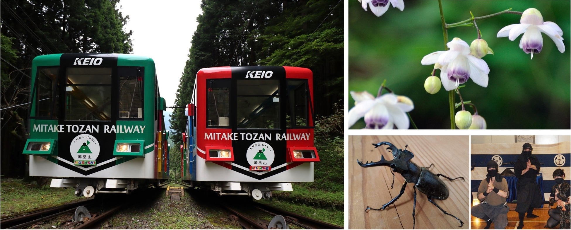 2023年4月にスタートした「ただの山、じゃない。御岳山」プロジェクトの一環として7月1日(土)から御岳登山鉄道株式会社協力のもと、本プロジェクトキャラクター「MITAKEさん」をあしらった御岳山ケーブルカーの運行がスタート。乗車されたお客さまに運行スタートを記念した乗車証の配布を行います*。その他にも第20回「みたけさん レンゲショウマまつり」や親子で楽しめる忍者体験や昆虫観察会など、御岳山を楽しめる様々な企画をご用意いたしました。
