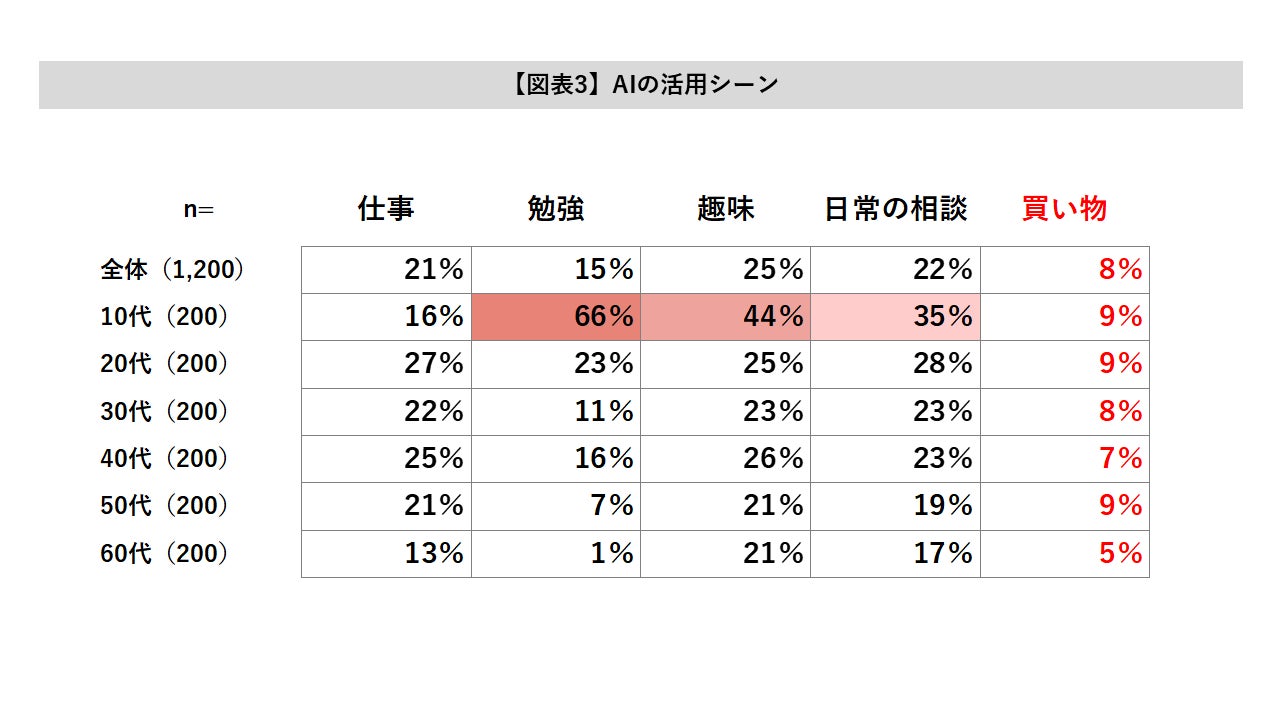 AIは日常的なタスクや思考支援のツールとしては浸透しつつあるものの、「買い物・購買に関する目的でAIを活用した」と回答した人は1割未満にとどまりました。【図表3参照】