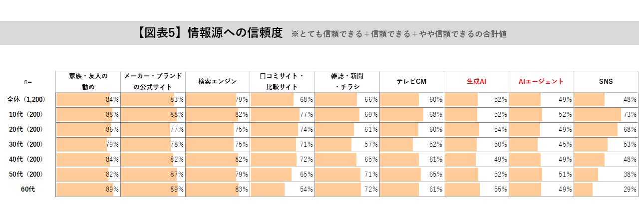 また、生成AI・AIエージェントを「とても信頼できる」「信頼できる」「やや信頼できる」と回答したのは全世代で約50%と、SNSと同程度の水準でした。テレビCMに次ぐ信頼度といえます。【図表5参照】