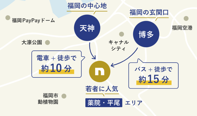 ・学校の場所は「博多駅」「天神駅」からも約15分以内にある【薬院・平尾エリア】なのでアクセス良好