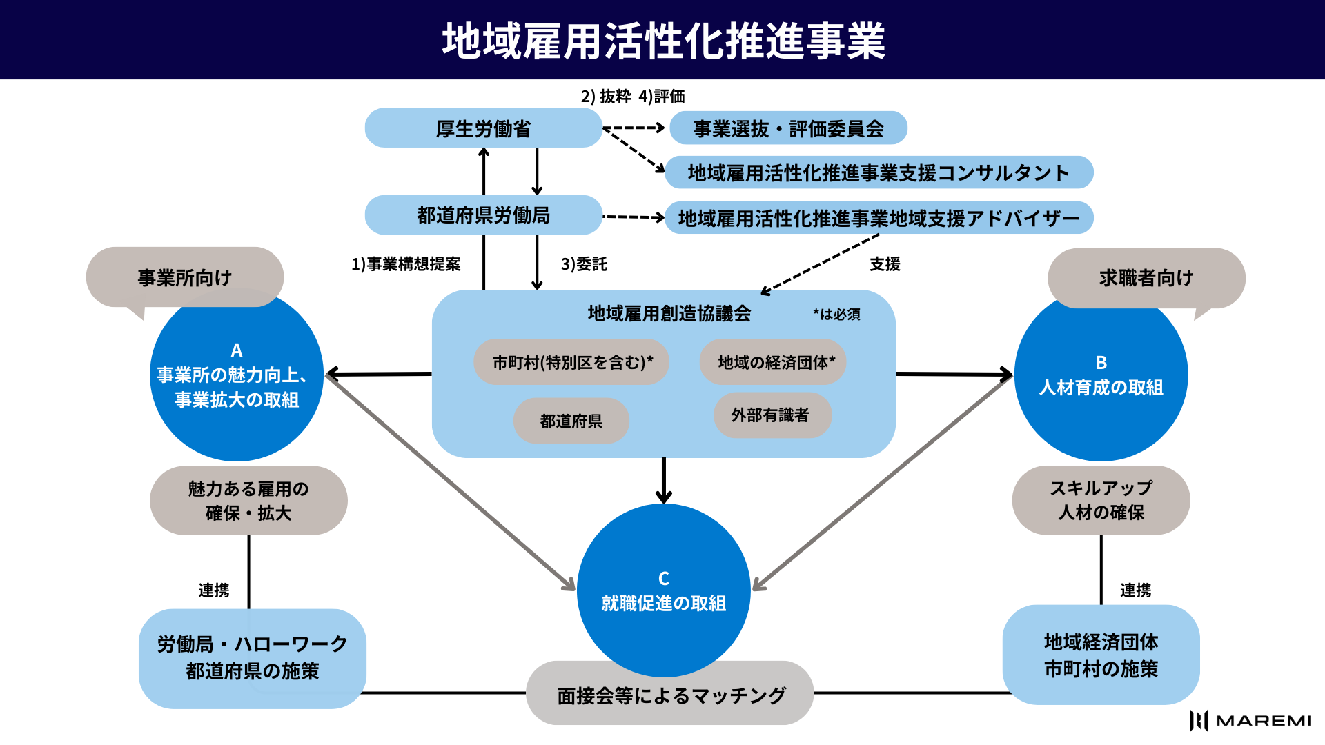 地域雇用活性化推進事業は、市町村(特別区を含む。以下同じ)等が実施する産業復興施策や各府省の地域再生関連施策等との連携の下に、市町村と経済団体等から構成される地域雇用想像協議会(以下「協議会」という。)が提案した事業構想の中から「魅力ある雇用やそれを担う人材の維持・確保効果が高いと認められるもの」や「地域の産業及び経済の活性化等が期待できるもの」をコンテスト方式で選抜し、当該協議会に対しその事業の実施を委託するものです。