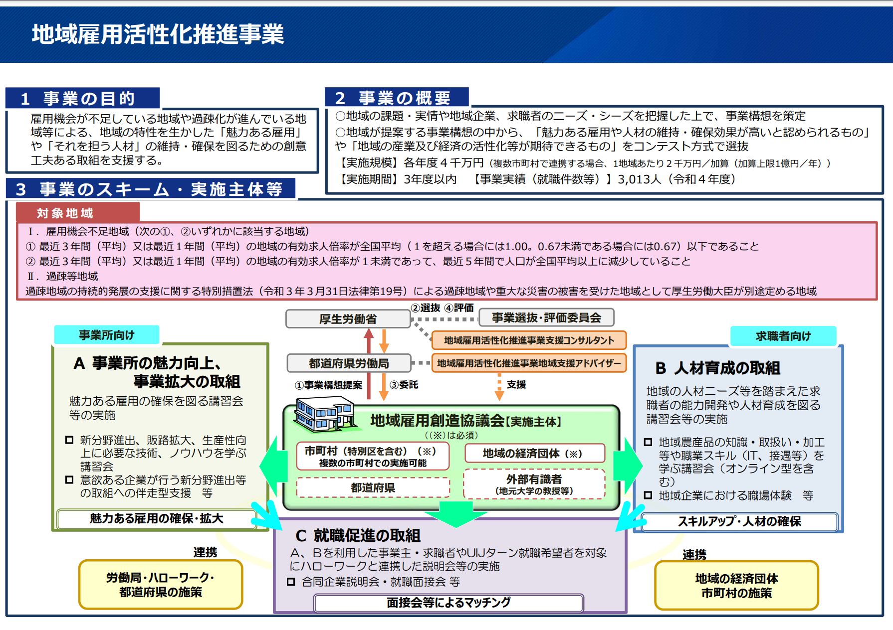 雇用機会が不足している地域や過疎化が進んでいる地域等による、地域の特性を活かした「魅力ある雇用」や「それを担う人材」の維持・確保を図るための創意工夫ある取組を支援します。