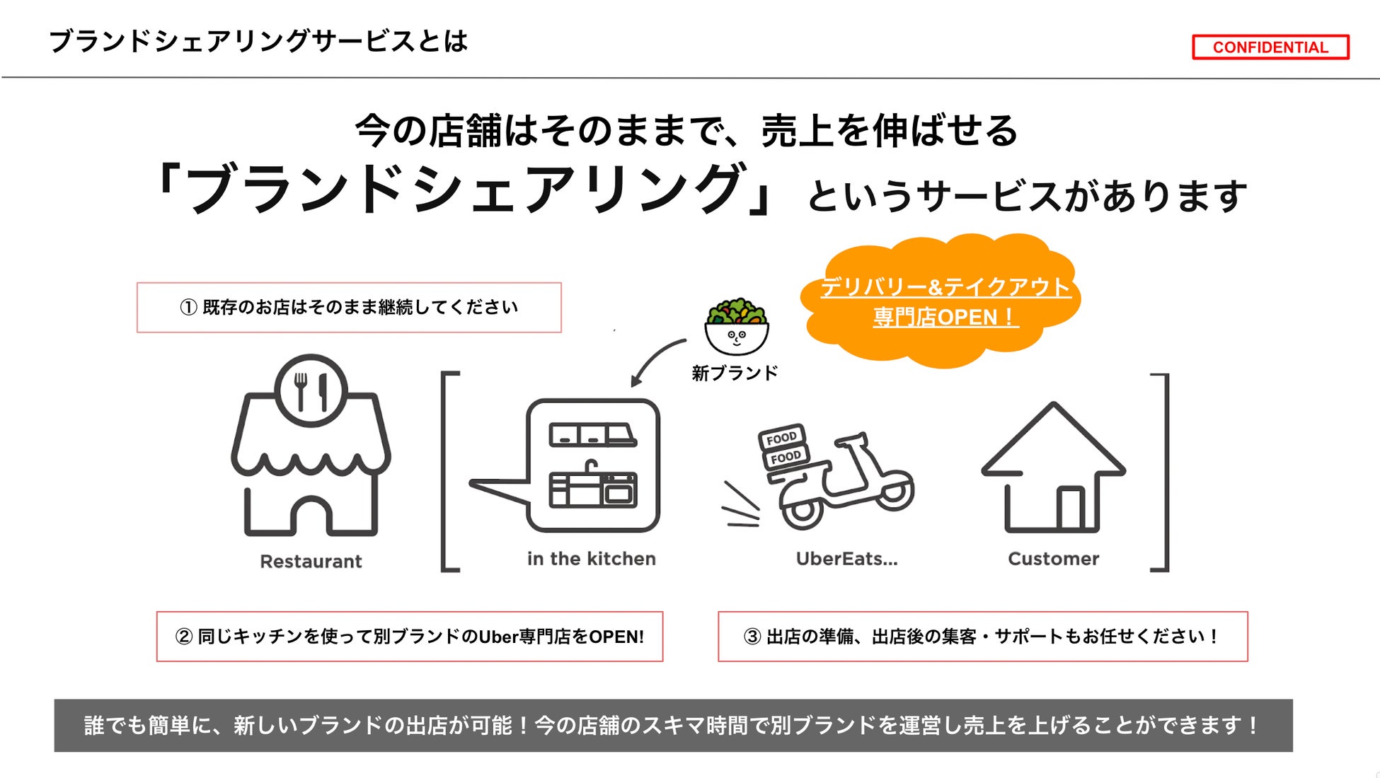 今の店舗はそのまま運営をしながら、Uber Eatsや出前館などのデリバリーサービスを活用し、新たなブランドを運営することで、売上を最大化させていく飲食店の新しいビジネスモデルです。