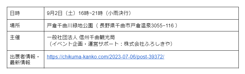 主催 | 一般社団法人 信州千曲観光局 後援:千曲市・千曲川ワインバレー特区連絡協議会 (イベント企画・運営サポート:株式会社ふろしきや) |