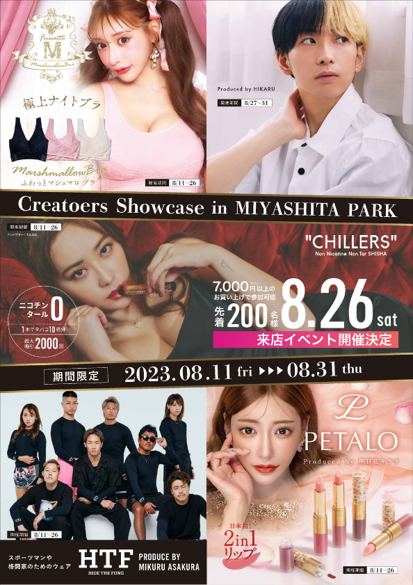 2023年8月11~31日に【ヒカル・明日花キララ・朝倉未来・てんちむ】の豪華タレントが作り上げたブランドが展示。タレントの来場イベントも開催!!