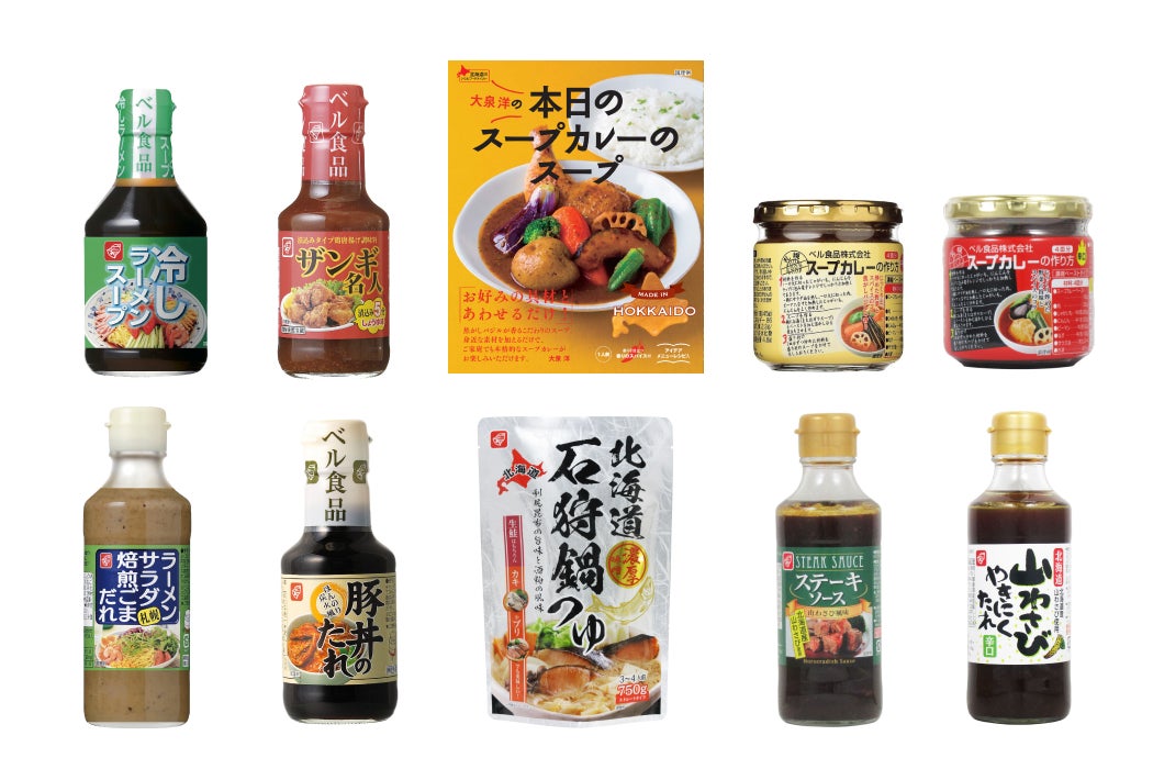 1965年(昭和40年)に発売した「冷しラーメンスープ」は大ヒット。冷やし中華のことを「冷しラーメン」と呼ぶ道民が今でも多いのは「冷しラーメンスープ」の影響が大きいと言えます。1995年(平成7年)には北海道の漬け込み唐揚げであるザンギの味付けを簡単にできる調味液「ザンギ名人」を発売。また、2004年(平成16年)には俳優の大泉洋さんが監修したスープカレースープ「本日のスープカレーのスープ」、翌年2005年(平成17年)にはペースト状のスープカレーの素「スープカレーの作り方」を発売し、札幌でブームとなったスープカレーを、専門店で味わうグルメから家庭でも簡単に楽しめるソウルフードに昇華させました。その他にも帯広・十勝地方のソウルフード豚丼を手軽に作れる「豚丼のたれ」、札幌発祥のラーメンサラダ専用「ラーメンサラダのたれ」、石狩鍋や味噌バター鍋、スープカレー鍋など北海道らしい鍋を楽しめる「北海道鍋つゆシリーズ」なども販売。近年は北海道ではお馴染みの薬味である山わさびを使った「ステーキソース山わさび風味」や「北海道山わさびやきにくたれ」など、山わさびの商品化にも力を入れています。