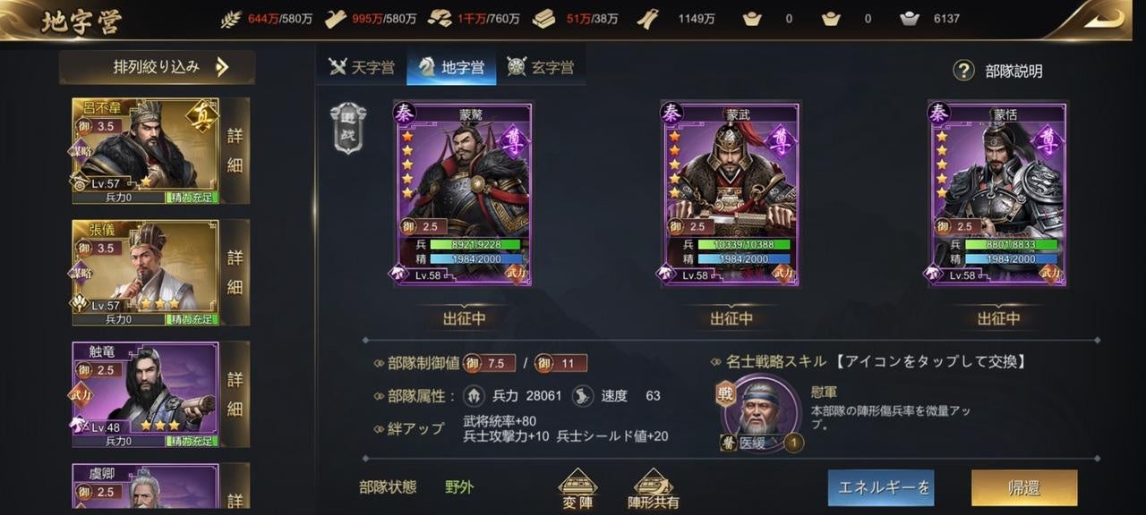 朝焼けの花:蒙恬と蒙武と蒙骜。紫武将は金武将より獲得・育成しやすいし、3人が一緒に同じ兵営にいると絆効果を触発できますので、土地や城などを攻略する際にもいい効果を発揮できます。