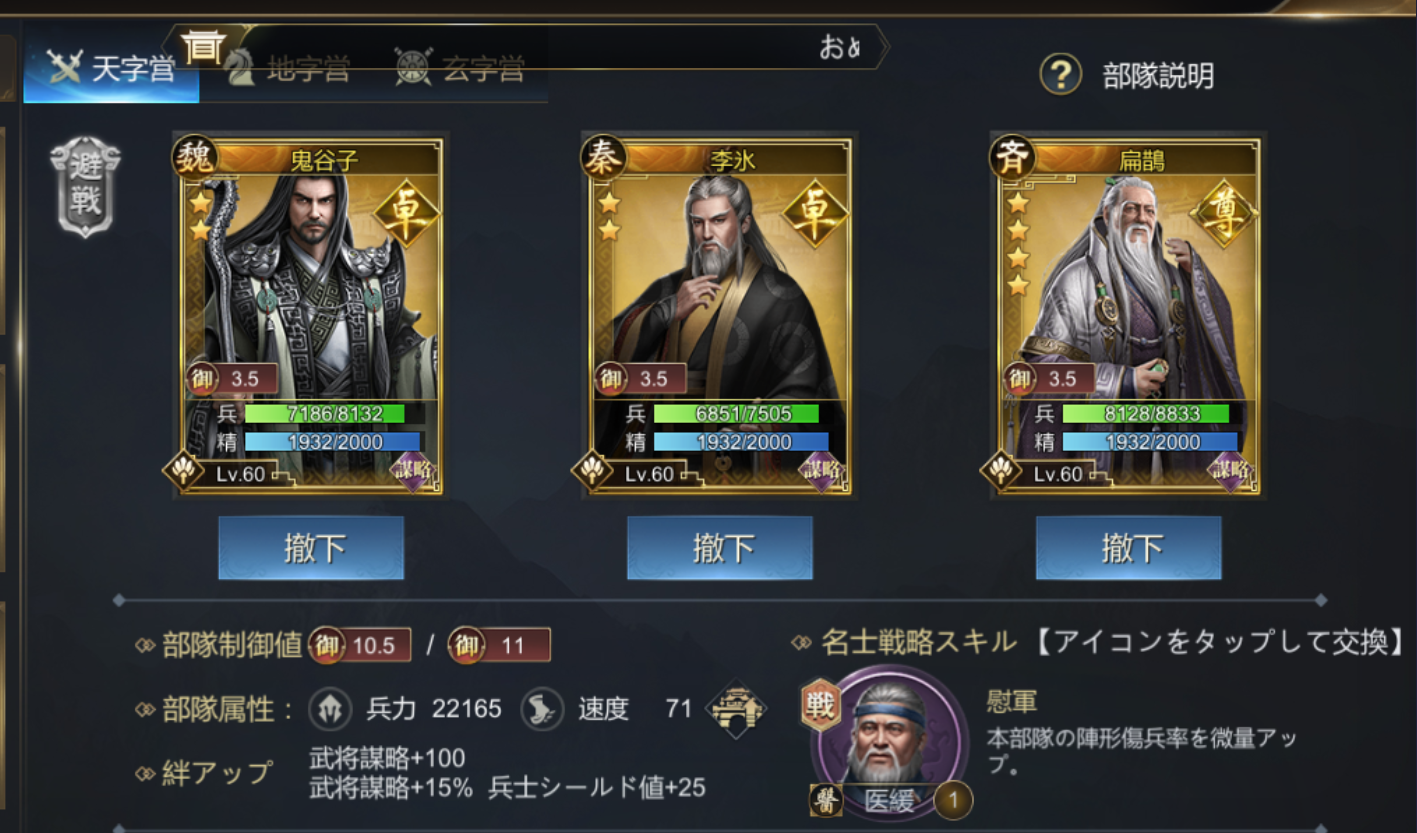 武将ごとに独自の兵種があります。ゲームには合計12個の兵種があり、ステージごとに登場します。例えば名医・扁鵲は策士、商鞅将軍は騎兵などです。