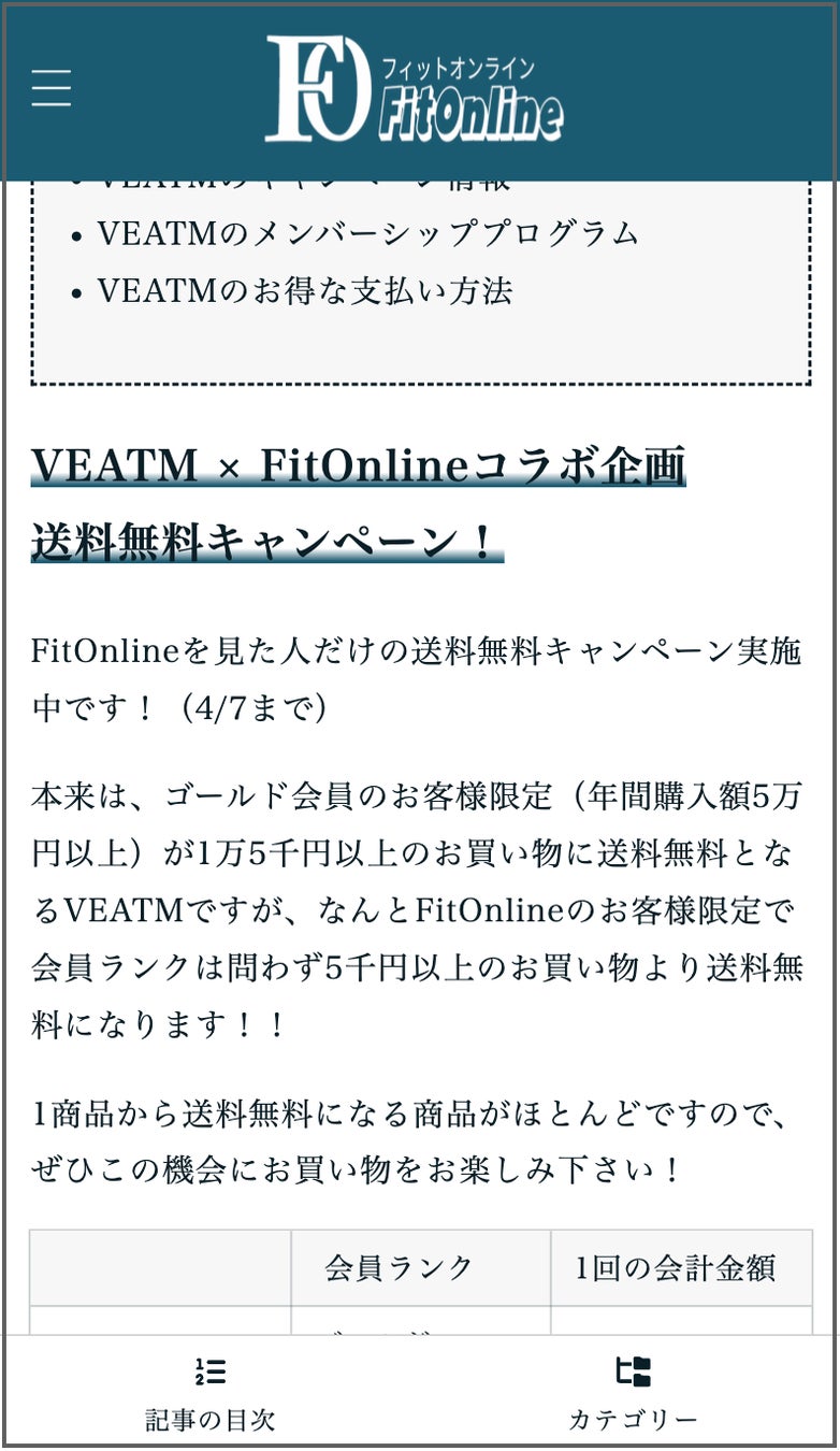 2. リンク先「VEATM × FitOnlineコラボ企画送料無料キャンペーン!」と書かれている箇所より、送料無料キャンペーンをご確認いただけます。