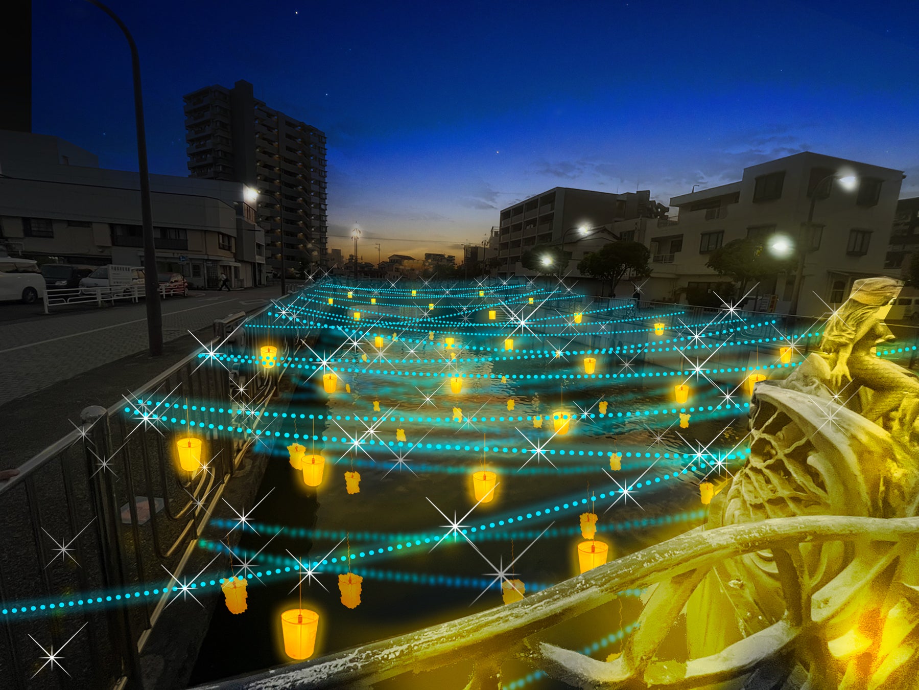 | 祈りのランタン装飾 | 空をイメージした青い装飾の中に浮かべたランタンの光が水面に反射します。ランタンには、参加者の願いや想いが描かれています(ターントクルこども館のワークショップで作成)。 | 小石川めがね橋 |
