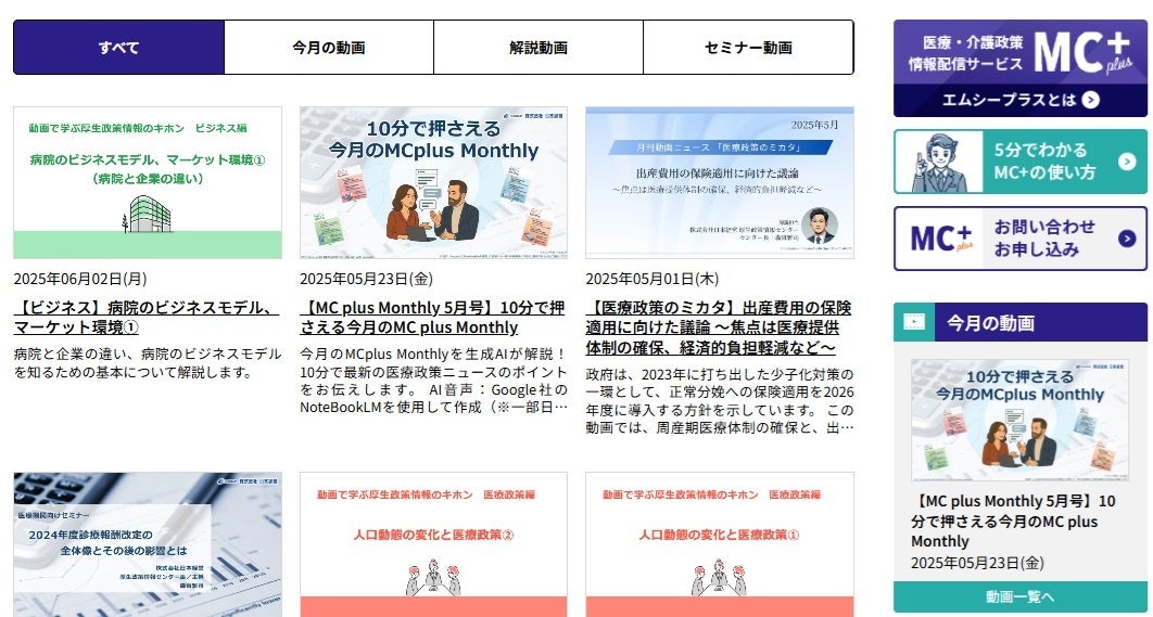 医療・介護の経営に関する情報を配信する「MC plus(エムシープラス)」サイトをリニューアルし、動画コンテンツの本格的な配信をスタートしました。