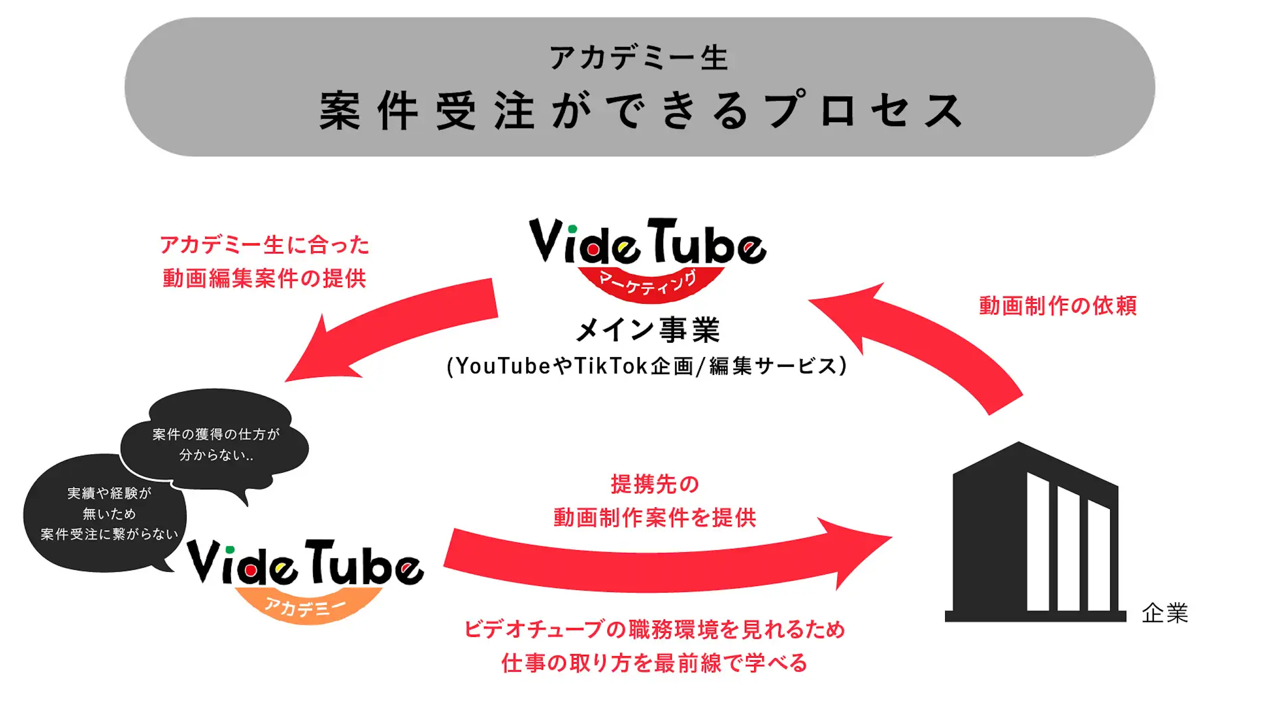 ビデオチューブではこの需要の高まりを受け、動画編集アカデミー”ビデオチューブアカデミー”のサポートを一部公開します。下記のサポート体制により、専業や副業で活躍し続けられる自立できる動画クリエイターを育成する環境を提供いたします。