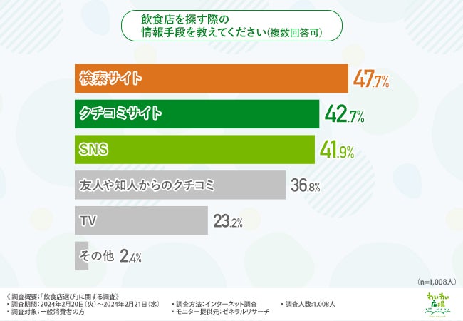 「飲食店を探す際の情報手段を教えてください(複数回答可)」と質問したところ、『検索サイト(47.7%)』と回答した方が最も多く、次いで『クチコミサイト(42.7%)』『SNS(41.9%)』と続きました。